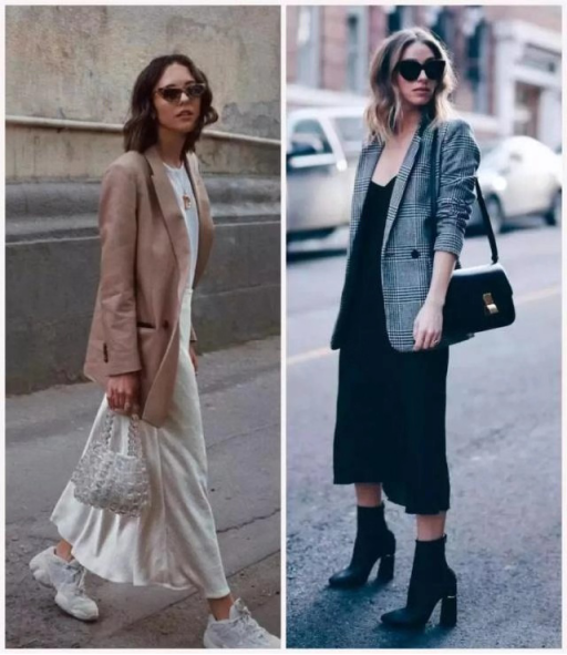 But pairing it with a suit jacket will make you look much slimmer. The combination of the heroic suit jacket and the gentle and sexy satin dress , does it surprise you? The combination of a soft satin skirt and the toughness of a suit makes you more feminine. The transparent and light fabric of the satin dress looks very high-end and dynamic. When paired with a suit, it perfectly blends sensibility and rationality, and the effect is great!