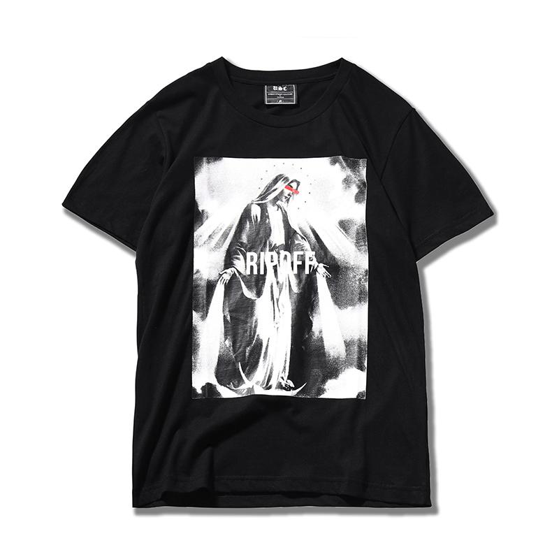 The blindfolded woman opens her arms as if to say something to the people below, interpreting a complicated and confusing story with a personalized picture print. The entire T-shirt is mainly black and white, highlighting the trend. The classic round neck fits the neck better, making it fashionable and personalized. A short-sleeved T-shirt that speaks of faith-themed style elements and is full of religious charm.