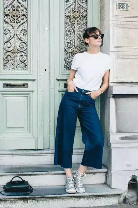 Blue denim with white, match made in heaven. Three-quarter wide-leg pants paired with a white T look refreshing.
