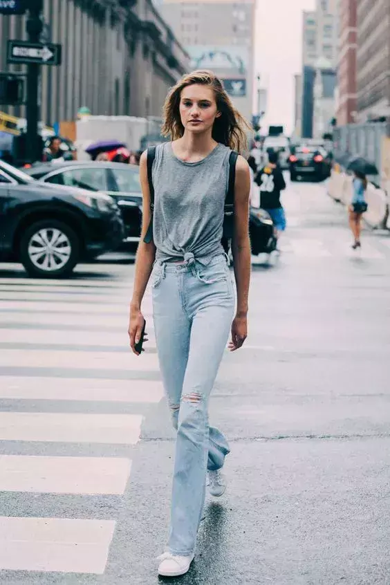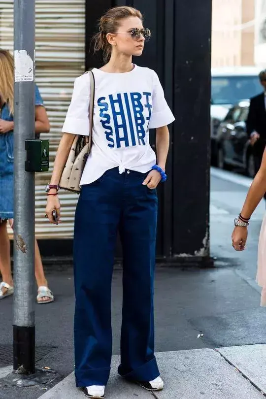 Wide-leg trousers are very tolerant and suitable for women of all shapes. In the summer, wear a pair of wide-leg trousers made of light denim and paired with a white T. The refreshing blue and white color scheme is very summery. I think To differentiate your look from others on the street, tie a knot in the front of your T-shirt to instantly look fashionable.