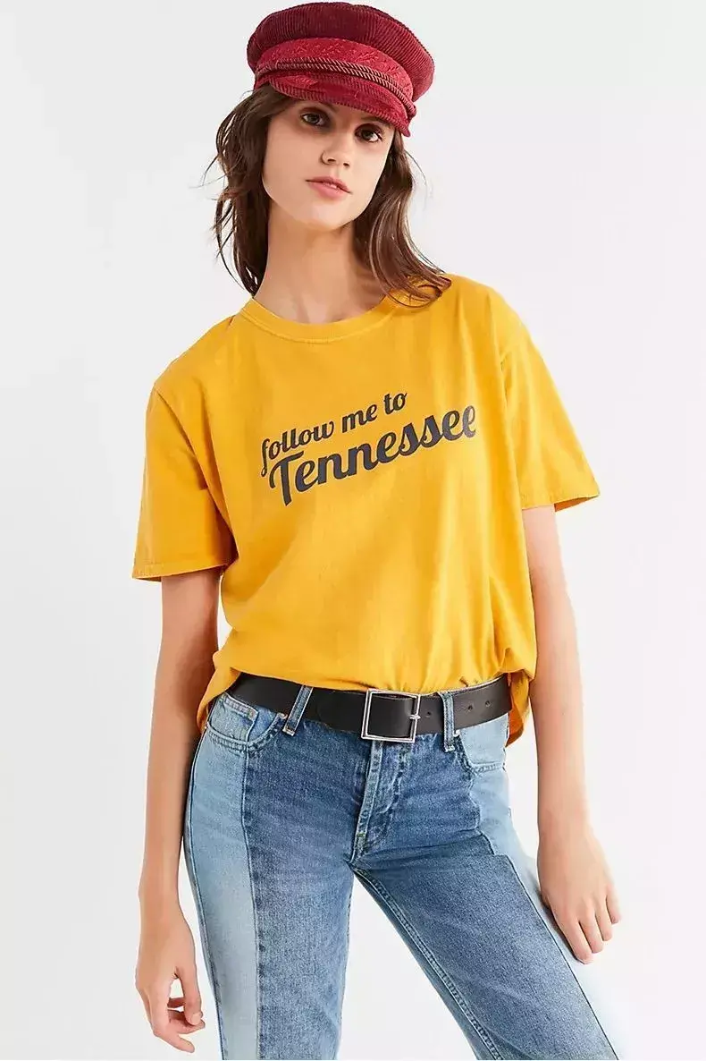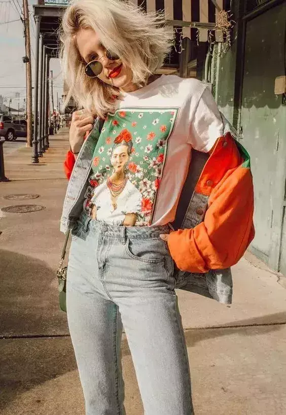 Another way to brighten up your look when paired with solid-color jeans is to work on a T-shirt, such as choosing a style with an eye-catching pattern. An outfit like the one below will easily catch people’s attention with a top.