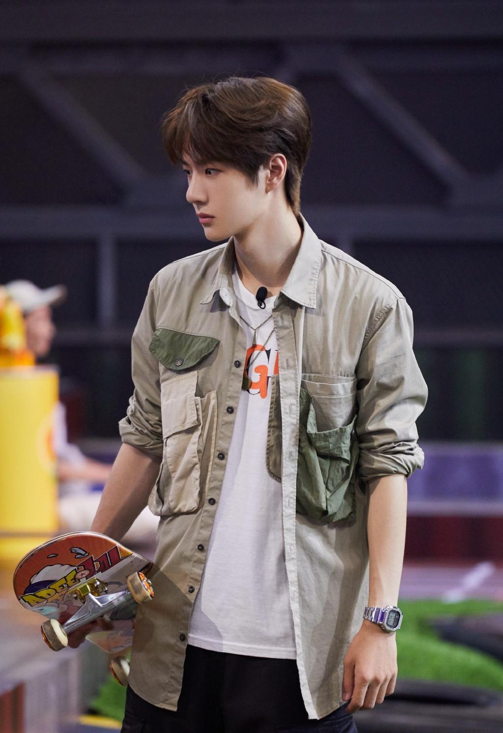 For Yibo who loves skateboarding, whether it is at the airport Whether it’s a look or a variety show, skateboarding is indispensable, and this patchwork military green shirt is very consistent with Yibo’s image of a skateboard boy. It is worn with a white T-shirt underneath, which is trendy and comfortable. He is a very refreshing big boy.