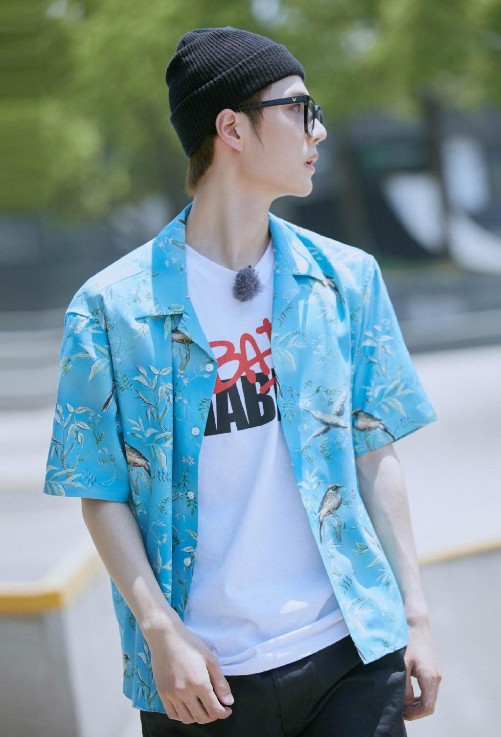 Blue is a very clean summer color, so for summer In terms of outfit, a blue printed shirt is definitely indispensable. It is still a white T-shirt underneath, a pair of black pants, and a black knitted hat, which is very eye-catching, plus the black-rimmed glasses worn by Yibo. , a proper young boy on campus.