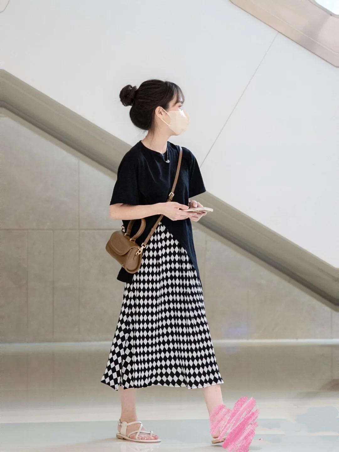 Pair a black slit T-shirt with a high-waisted checkerboard skirt. The A-line cut is very slim and covers the flesh. The black and white combination is perfect for summer wear. Simple yet exquisite, extremely fashionable.