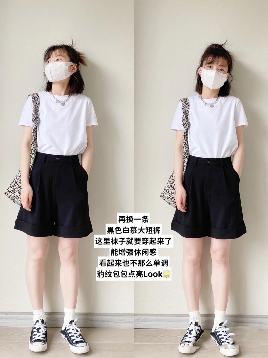 When matching a white T-shirt with Bermuda pants, it is recommended that you choose mid-calf socks or pile socks, which can enhance the overall sense of hierarchy and make it more casual. Bags embellished with leopard print elements enhance the eye-catching appeal of the overall outfit, making it fashionable and refreshing.