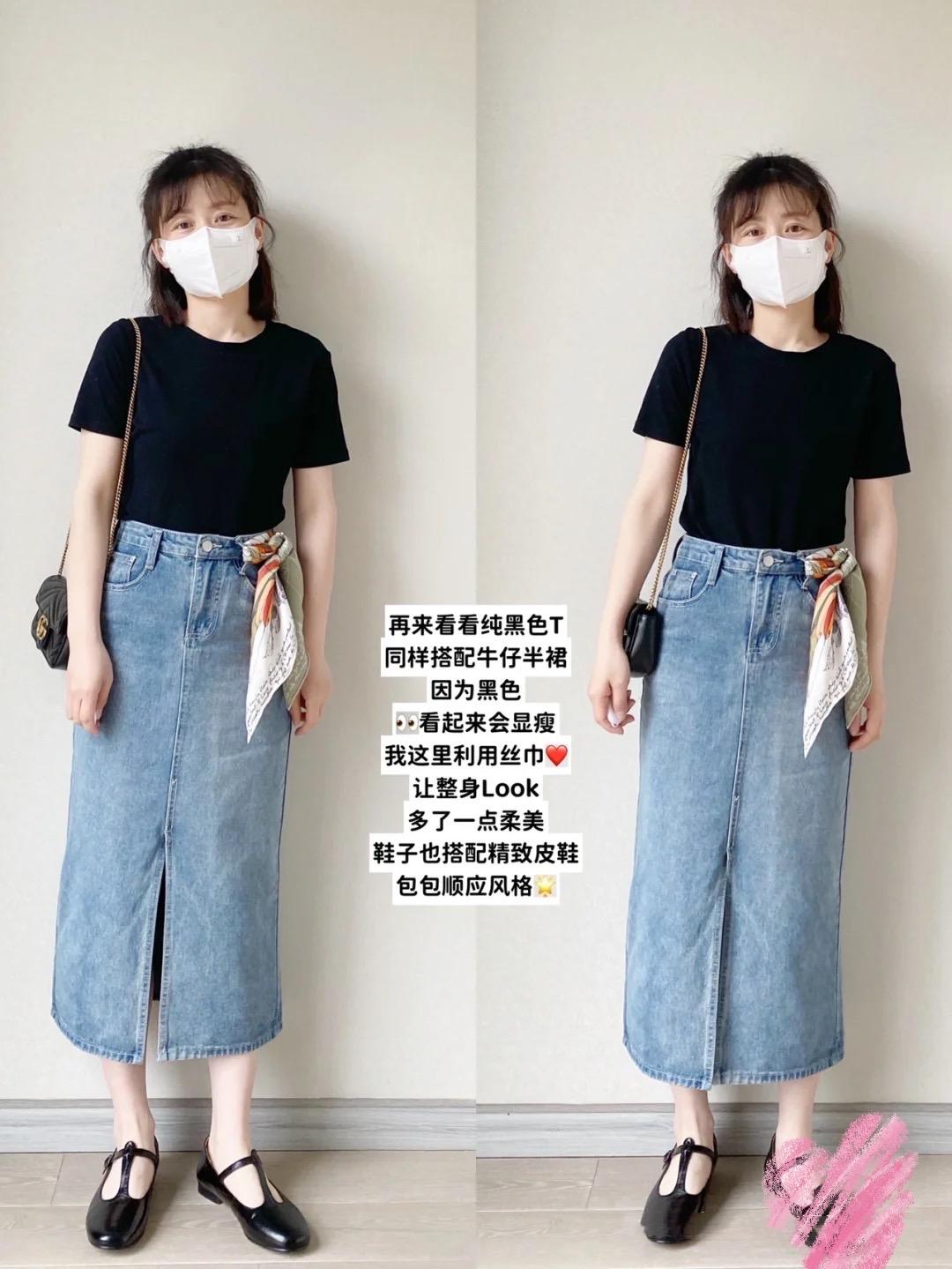 Although the black T-shirt is slimmer, it can also look dull. Black T-shirts are the best choice for daily matching. T-shirts are also a relatively basic item. If you directly match a black T-shirt with a denim skirt, it will inevitably look a bit stiff visually.