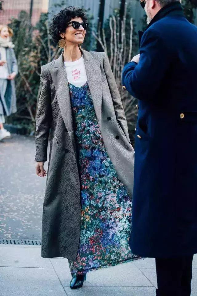 The gradient of blue oil flowers resembles Monet’s painting style, full of artistic flavor. The fine pattern of the silver leather buttoned coat is similar to that of the gauze skirt. Pair it with a white T-shirt with pink letter printing to bring a touch of freshness and simplicity.
