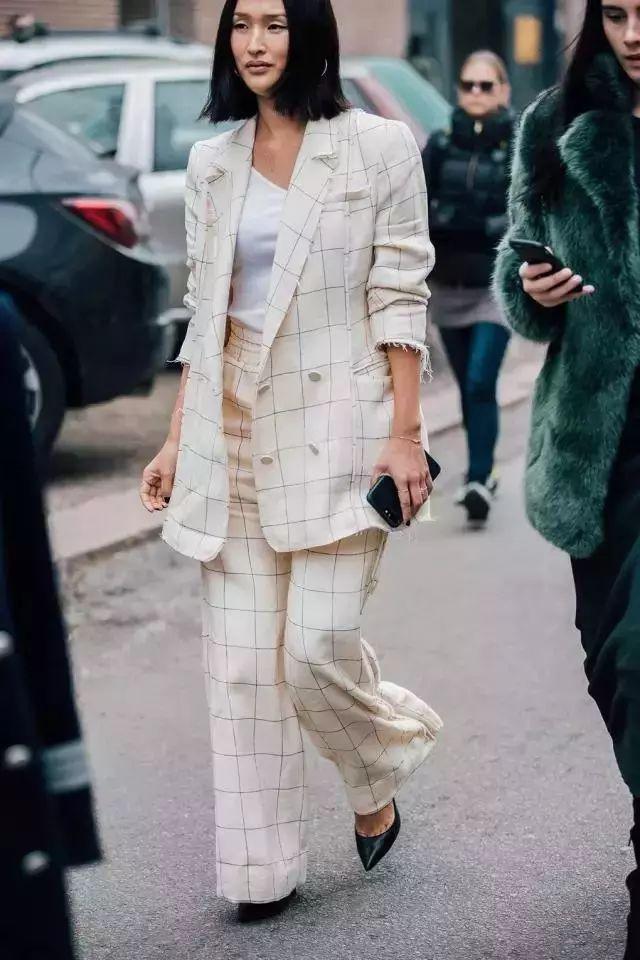 The beige fine plaid suit is elegant and elegant. The raw edges on the jacket cuffs are fashionable and casual. The high-waisted wide-leg pants elongate the leg curves, making the legs look taller and slimmer. . Basic black high heels are full of OL style, paired with a pure white T-shirt for a refreshing and simple look.