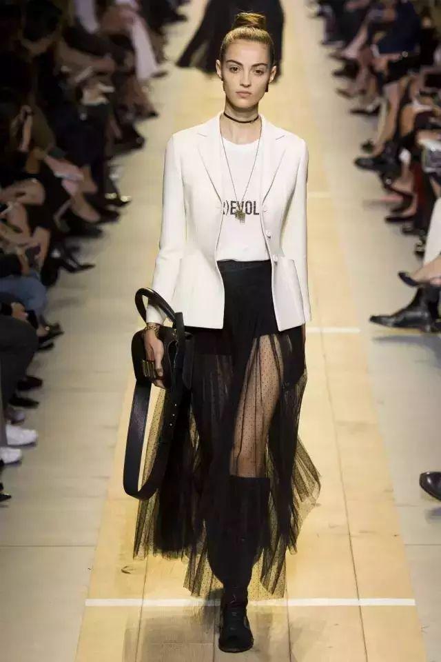 The letter-printed white T-shirt is also very aura when used on the catwalk. The black see-through gauze skirt with irregular hem looks like an elf dancing in the forest, low-key and attractive. The T-shirt and white suit jacket are similar in color, and the overall look is classic black and white.