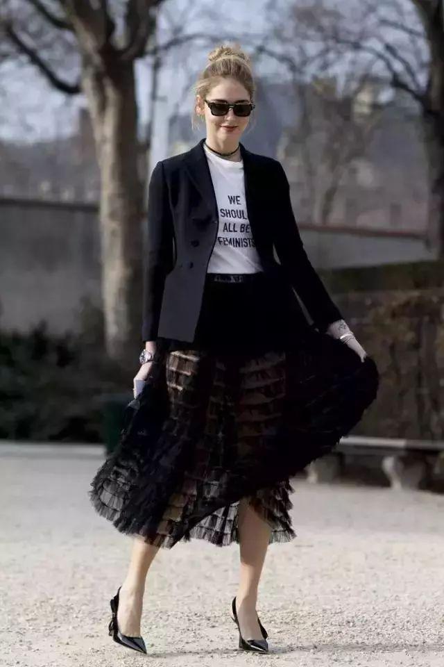 A pure black suit jacket is serious and formal. Pair it with a letter-printed white T-shirt to instantly look younger. Then transition to a layered see-through gauze skirt, which is light, flexible and sexy. A black choker and patent leather pointed-toe high heels also go well with it.