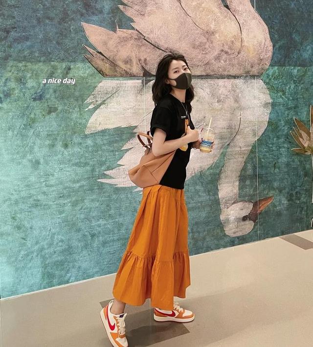 The orange skirt has a somewhat lazy and casual feel. The top is a black short-sleeved T-shirt. The combination of dark and bright colors, look at it. It won’t look boring.