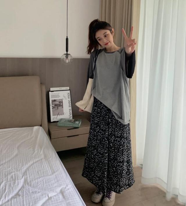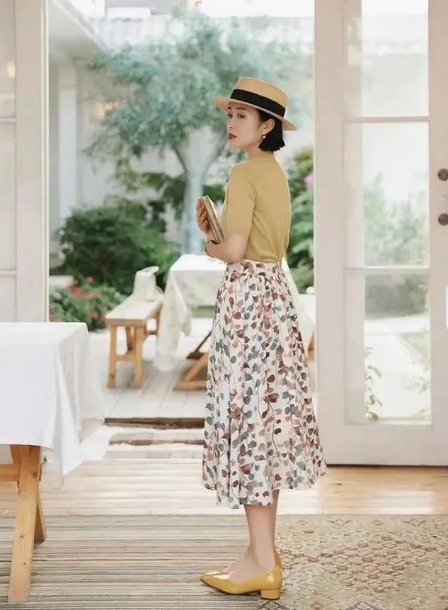 Like a floral skirt The season where this single product appears most often is summer, embellished with small floral elements and full of freshness. In the late summer and early autumn seasons, simply wear a solid color T-shirt on your upper body. The combination of simple top and traditional bottom is really very layered, right?