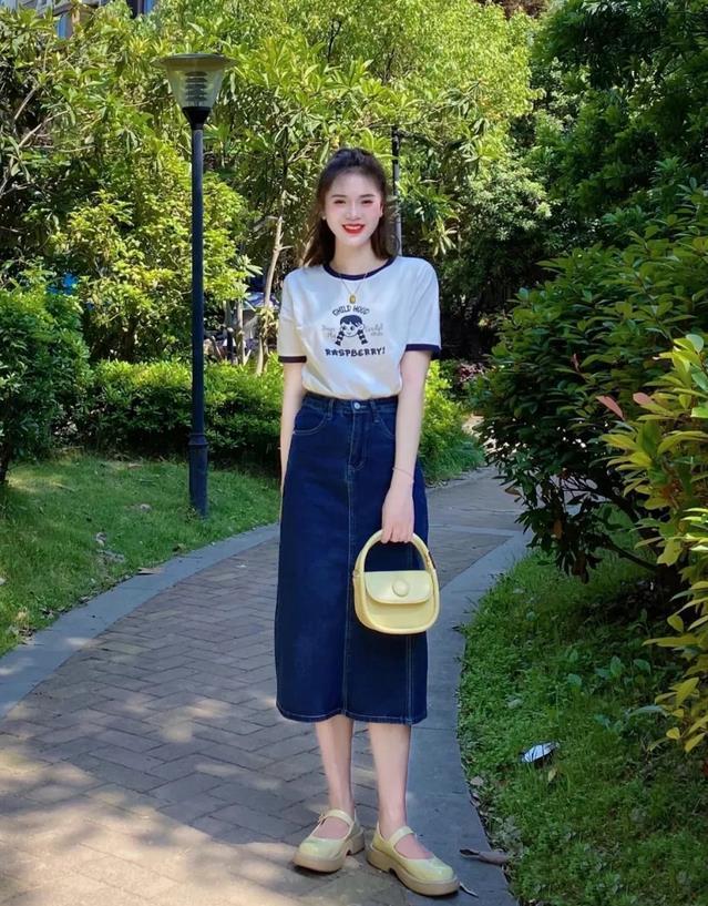 says Starting from the T-shirt + skirt outfit, regarding the choice of skirt, Lily thinks that the denim skirt is very good. The combination of these two items is really classic and versatile, isn’t it? The straight-leg denim skirt looks very slim when worn. It looks casual and still looks like a young girl.