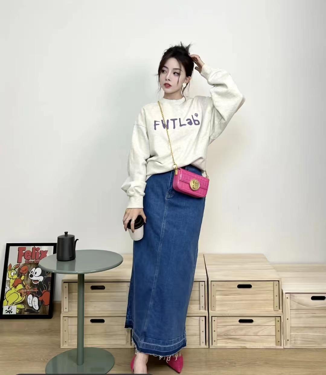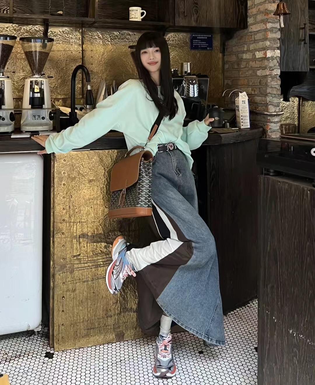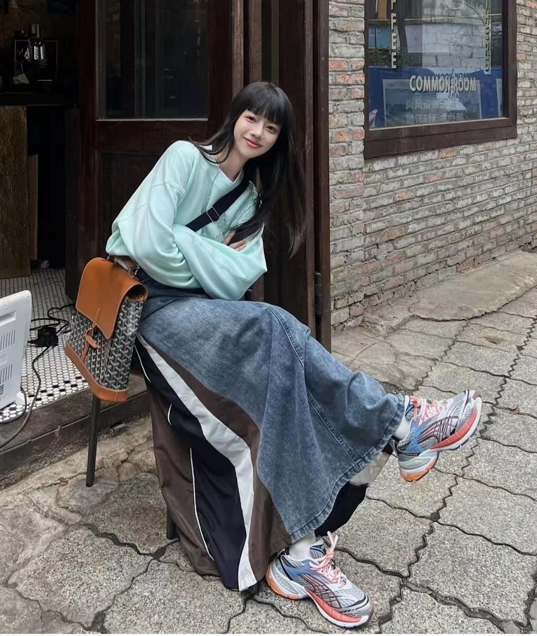 The sweatshirt and denim skirt are so cute. This contrasting color outfit really looks great in spring. The combination of warm-colored sneakers and cold-colored fake sweatshirts is very eye-catching. The long skirt with design adds to the overall sense of layering. The warm and fashionable outfit is also perfect for early spring. You will feel full of energy when walking.
