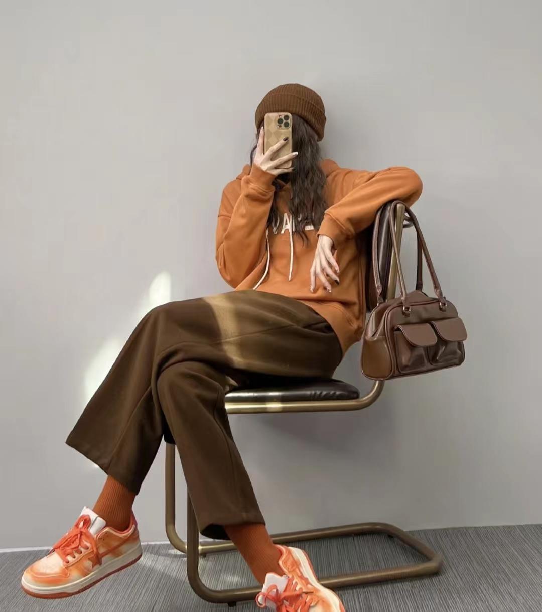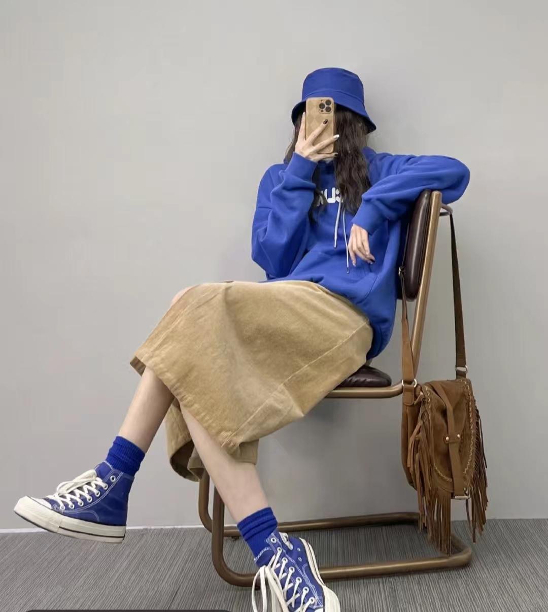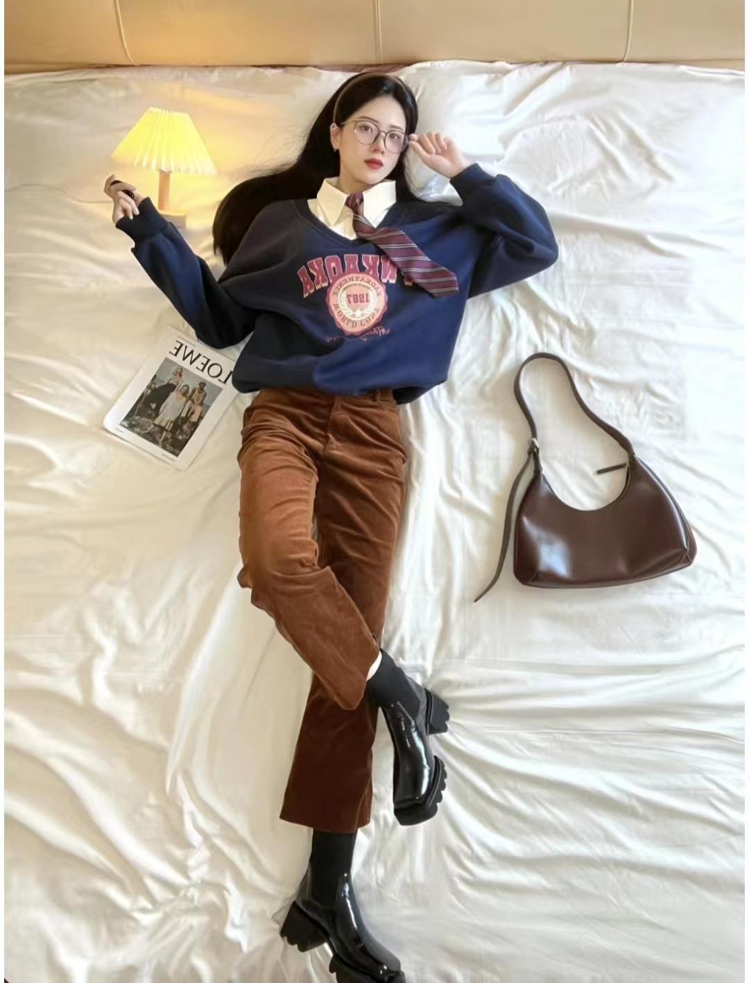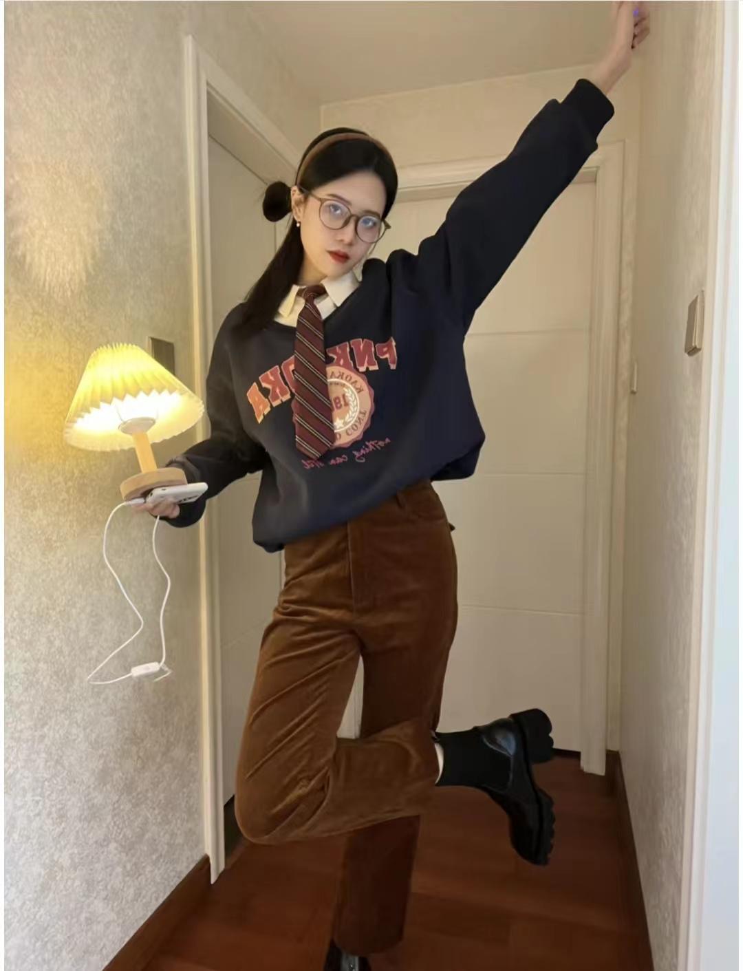 American retro college-style sweatshirt, the blue and brown color scheme has a 90s feel. This outfit idea is a fake two-piece tie sweatshirt + brown corduroy pants. It is a layered and full-textured set. Paired with a pair of thick-soled Chelsea, a small person can still be a sweet and cool senior.
