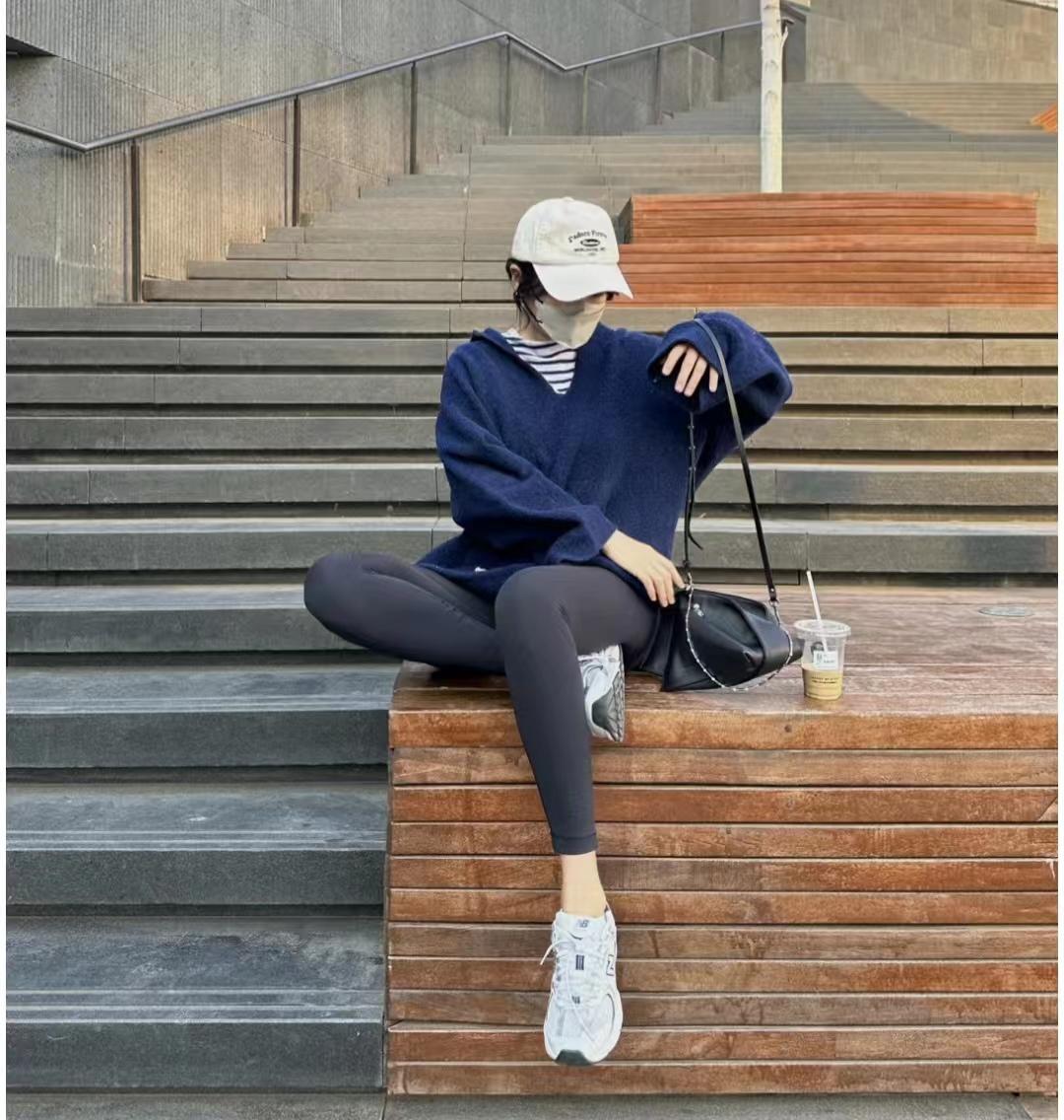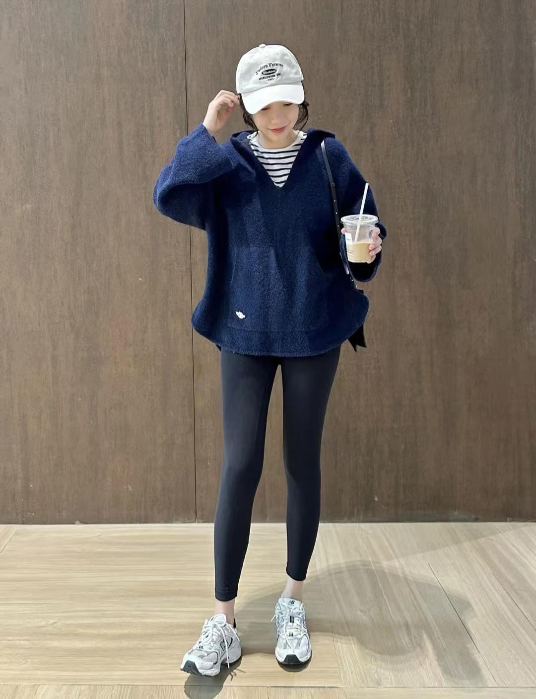 Wool knit No matter how you pair sweatshirt + leggings together, they look very Korean! The wool knitted hooded sweatshirt reduces age and is very suitable for commuting. It looks great paired with leggings and jeans. You can choose either striped or pure white T-shirts for the inner layer. The wide top and narrow combination is perfect for spring.