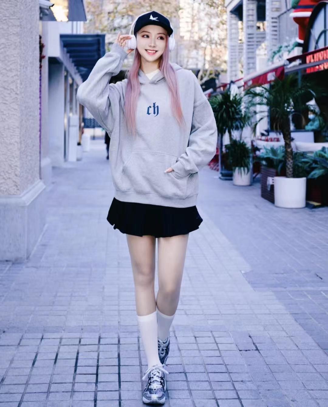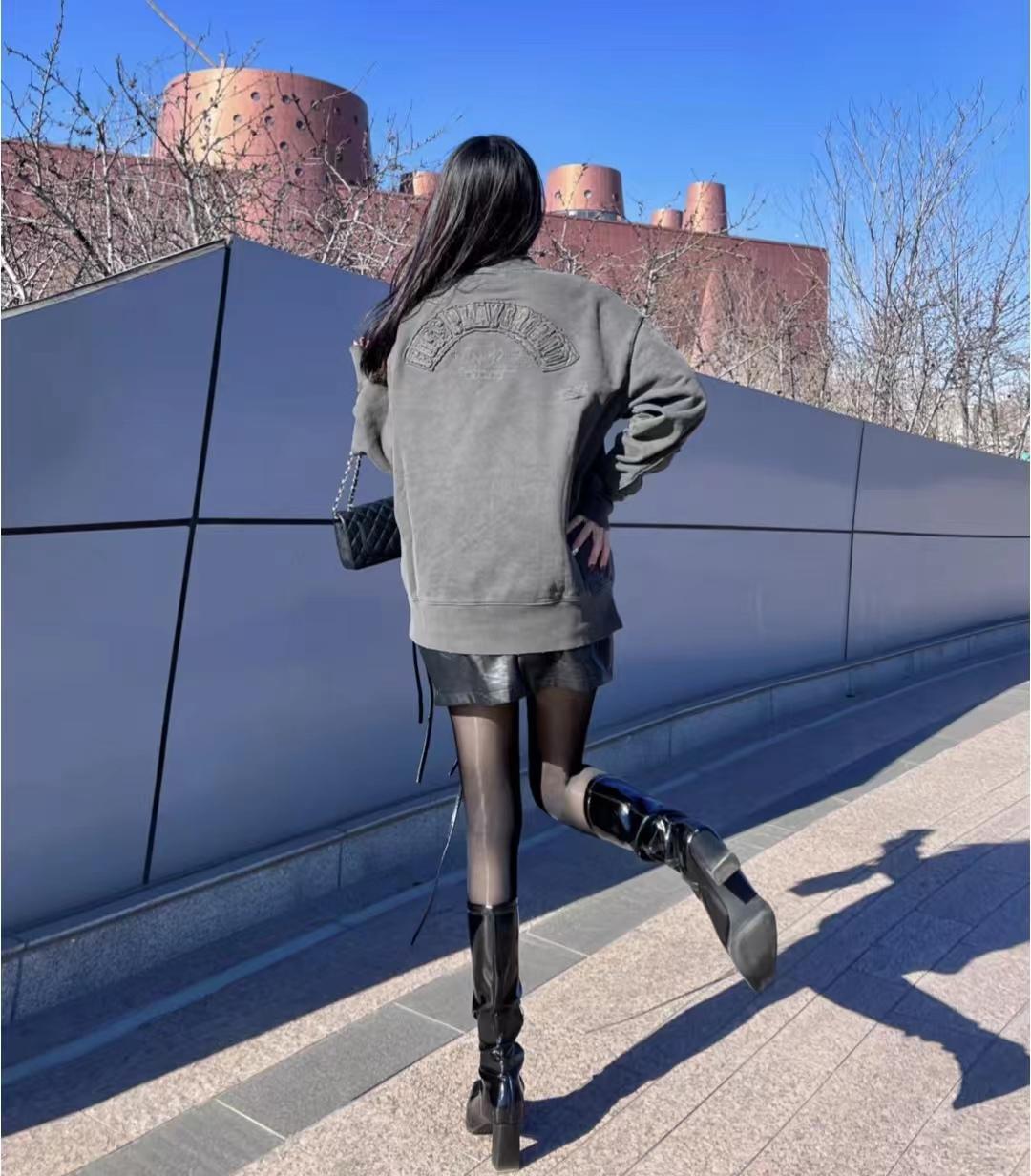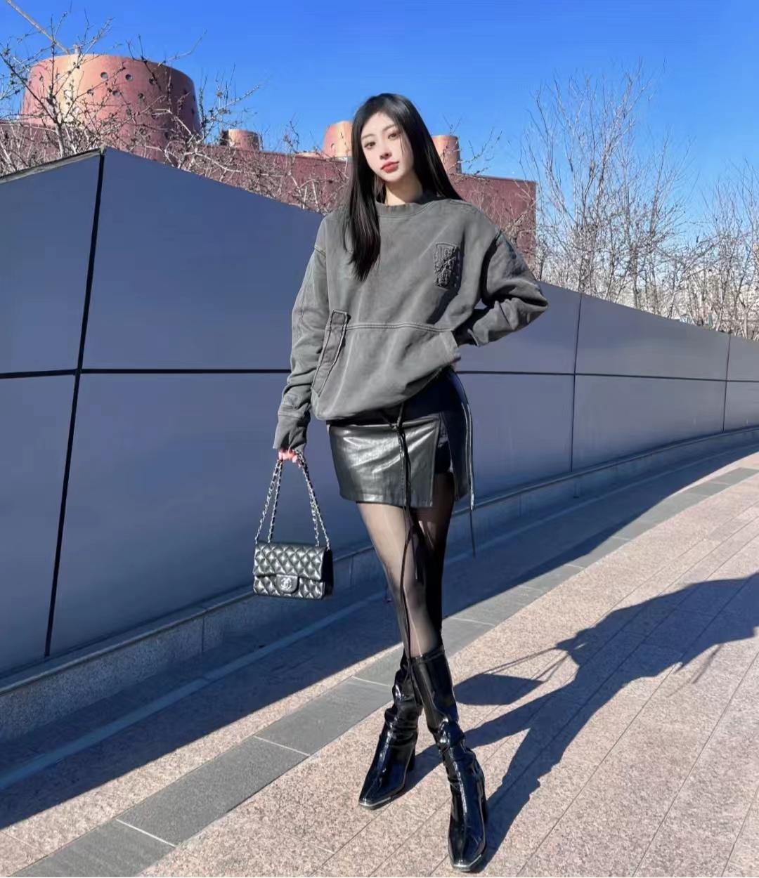 The loose and trendy sweatshirt has a stiff shape, so the lower body is matched softly. The lower body is worn with a leather skirt and leather boots. The bag is also black and the colors are uniform. The color of the sweatshirt is a very high-end fog gray. It also has a large pocket and a three-dimensional patch print on the back. It can be both sweet and cute + trendy and handsome.
