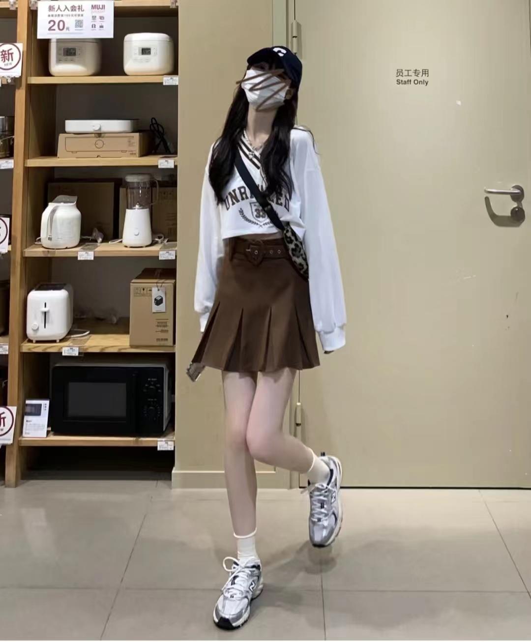 e-color: #A3A3A4;”>look9 short white sweatshirt + brown pleated skirt