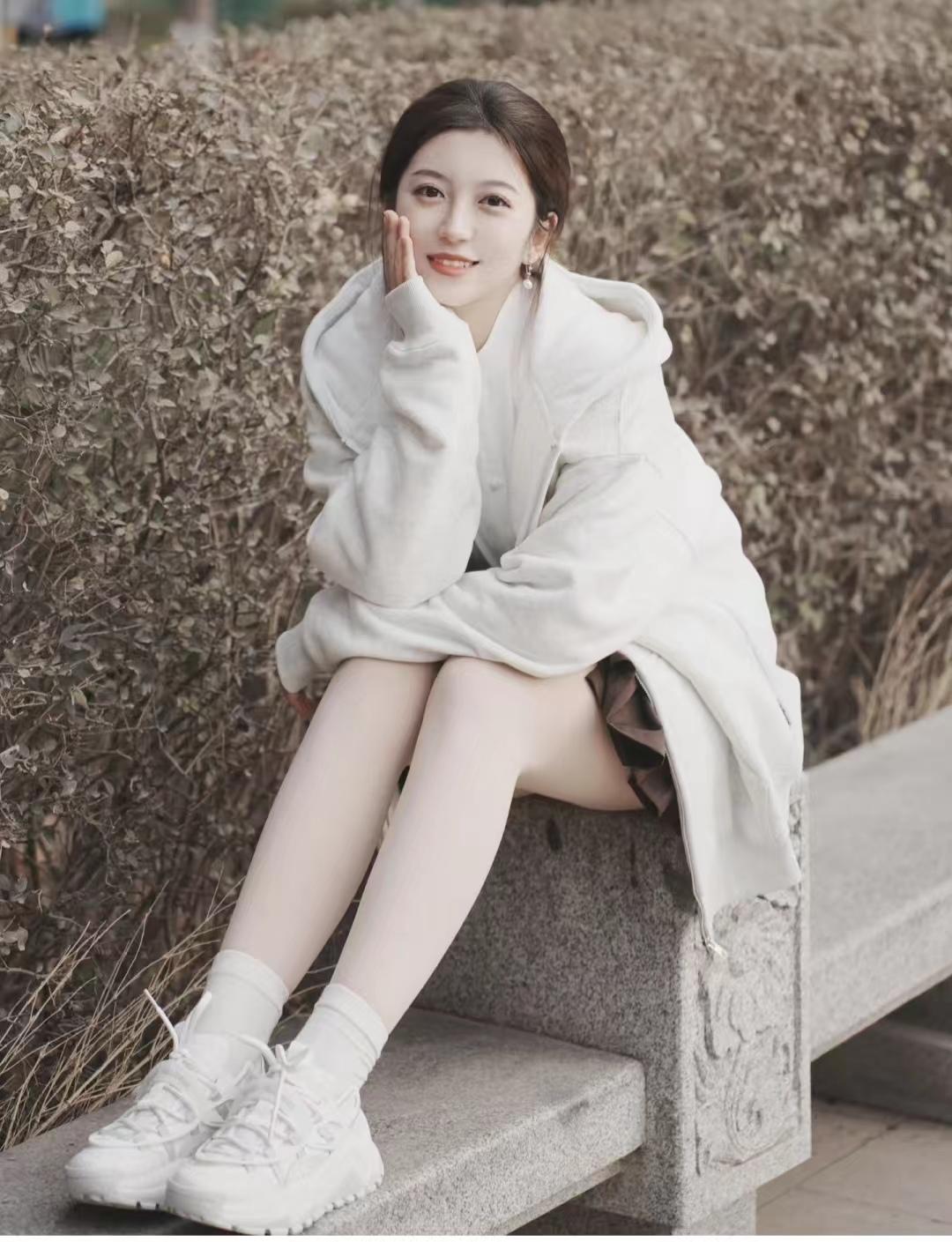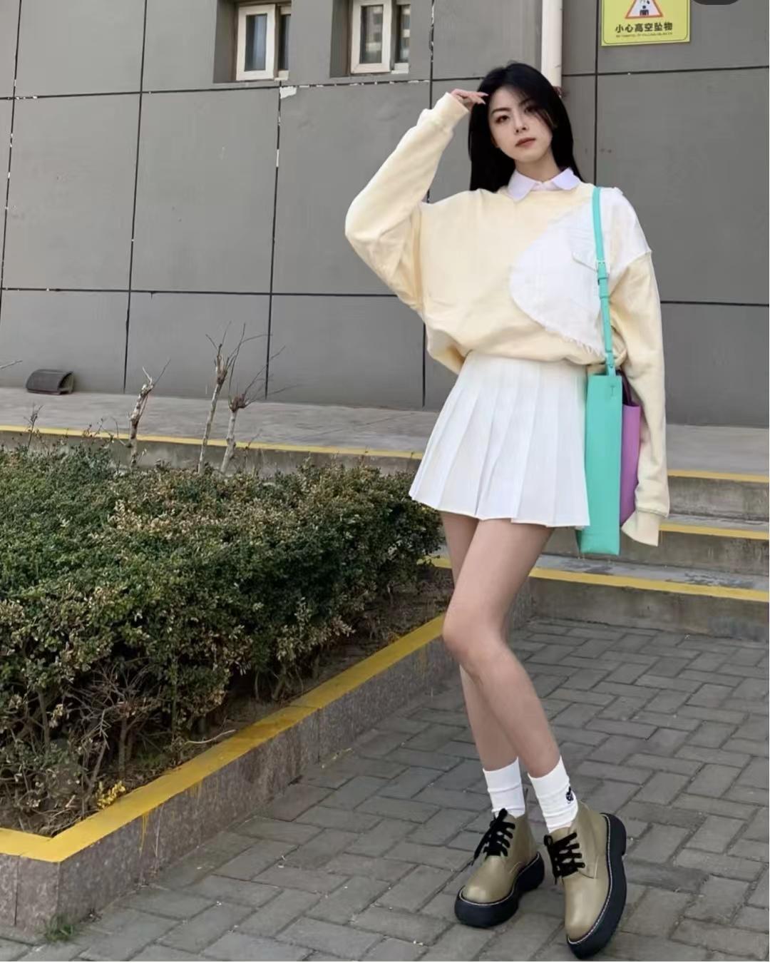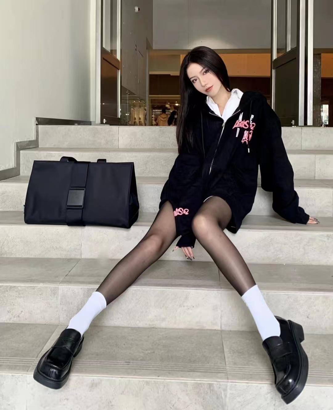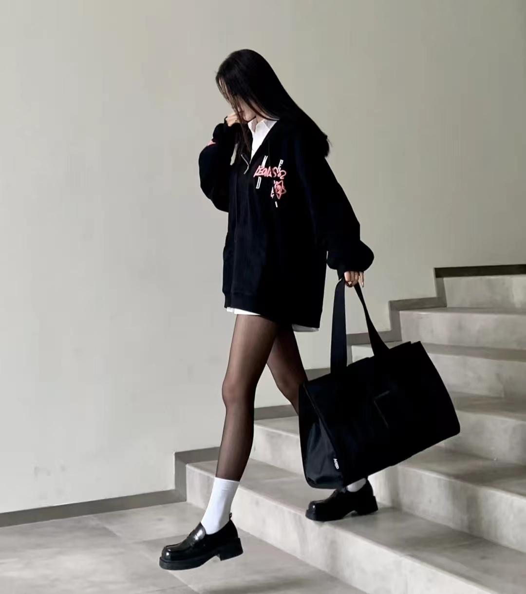 The hooded sweatshirt looks really small when paired like this. I have never dressed so academically before. I got the combination of stockings + white socks. I layered a shirt inside the hooded sweatshirt and paired it with a pair of small leather shoes. It’s really small.