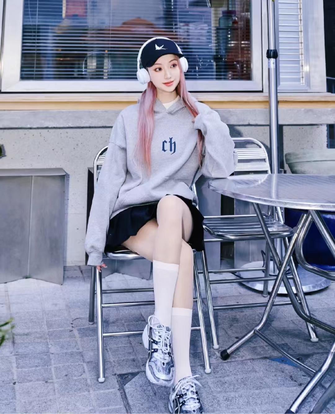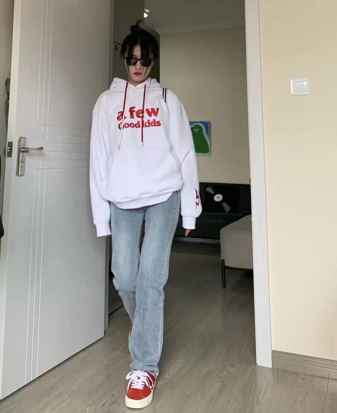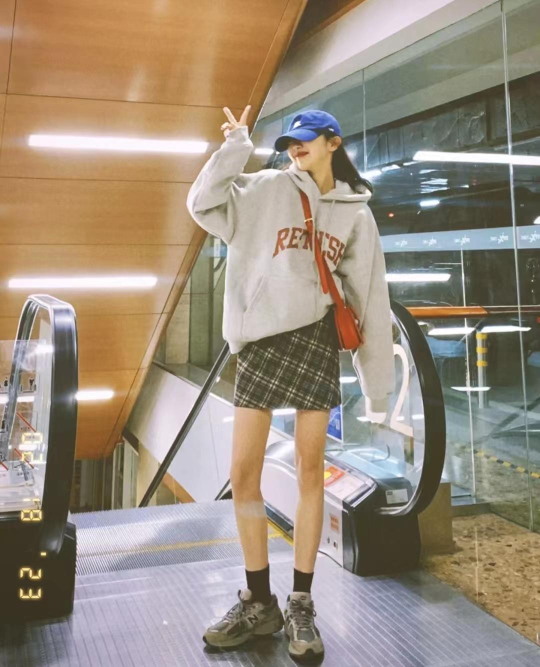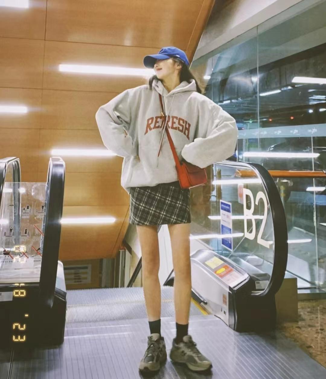 I really like this set of gray hooded American sweatshirt + plaid skirt. I really like this red lettered sweatshirt. It looks good and comfortable on the upper body. It matches the short plaid skirt + gray N-shaped shoes, American sweet and cool style are my favorite!