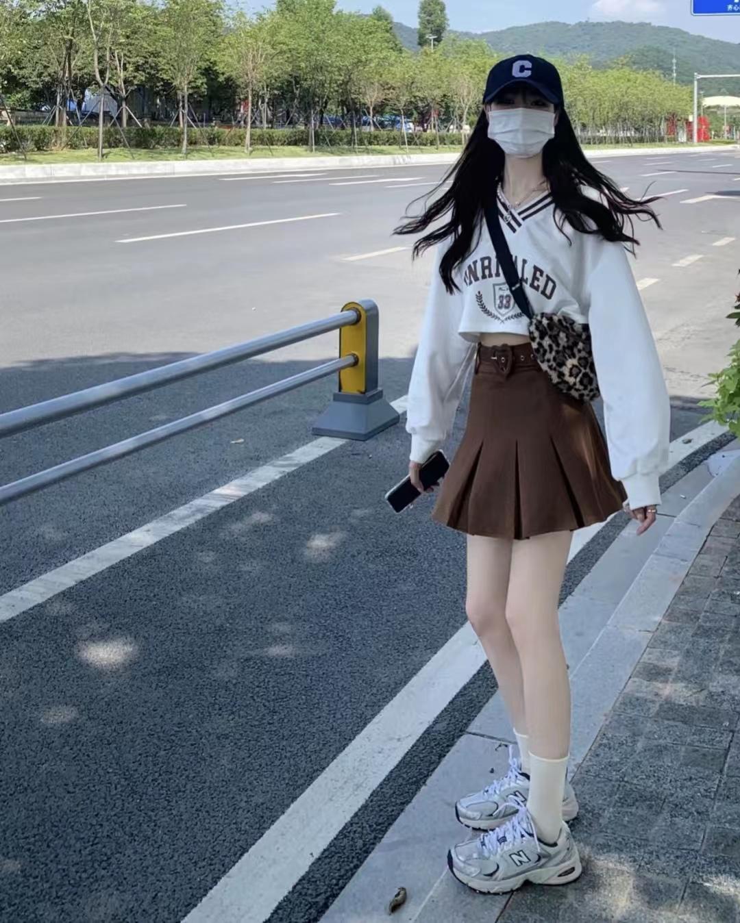 This set is full of girlishness, and looks good no matter how you look at the American school. The short sweatshirt above has a V-neck design. It is a short style, which makes the legs look longer. I like the letter pattern so much. The color is a coffee color that matches the skirt very well. The skirt is an A version pleated skirt. It matches love belt.