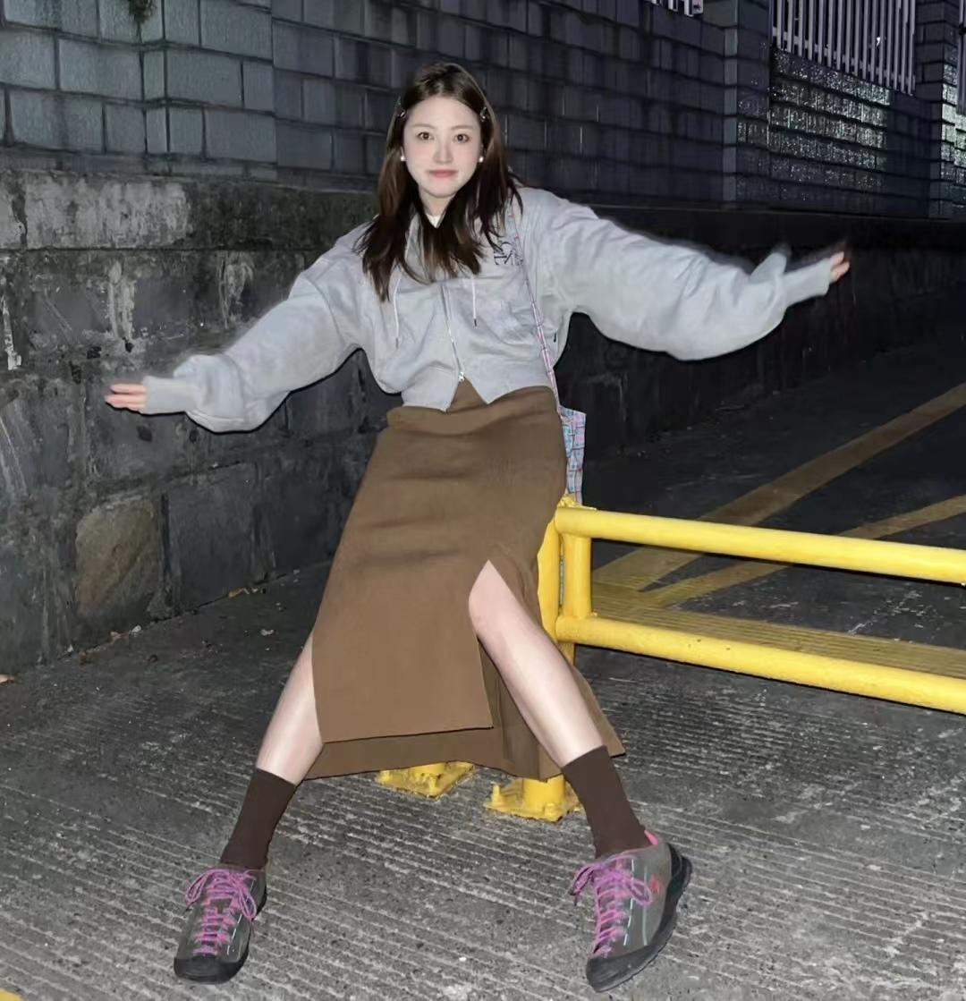 This set is full of girly, American college style No matter how you look at it, I think it looks good. The short sweatshirt above has a v-neck design. It is a short version, which makes the legs look longer. I like the letter pattern so much. The color is a coffee color that matches the skirt very well. The skirt is A pleated skirt with matching love belt.