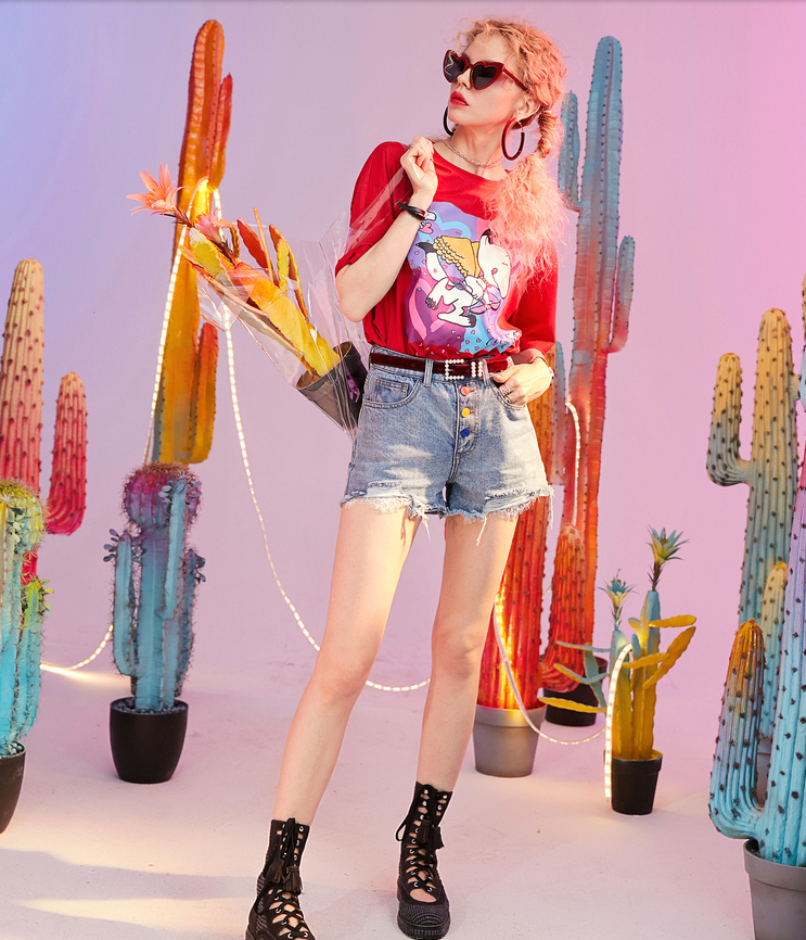 This printed T-shirt adopts a loose fit design, and the pattern uses an offset printing process and will not fade. It’s very strong and has a glittering effect on the wings. It has a very blingbling effect when going out in the summer.