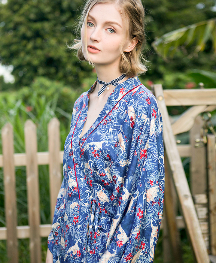 This printed suit is very unique. It uses a nice blue as the background color and looks retro when worn. The charm, paired with red flowers, makes it feel like spring.