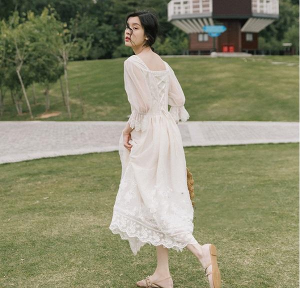 This white dress incorporates French style, which is gentle and retro. The back and front chest are designed with classic French laces, which is very literary and elegant. The cuffs of the sleeves are spliced with lace, which is full of forest style.