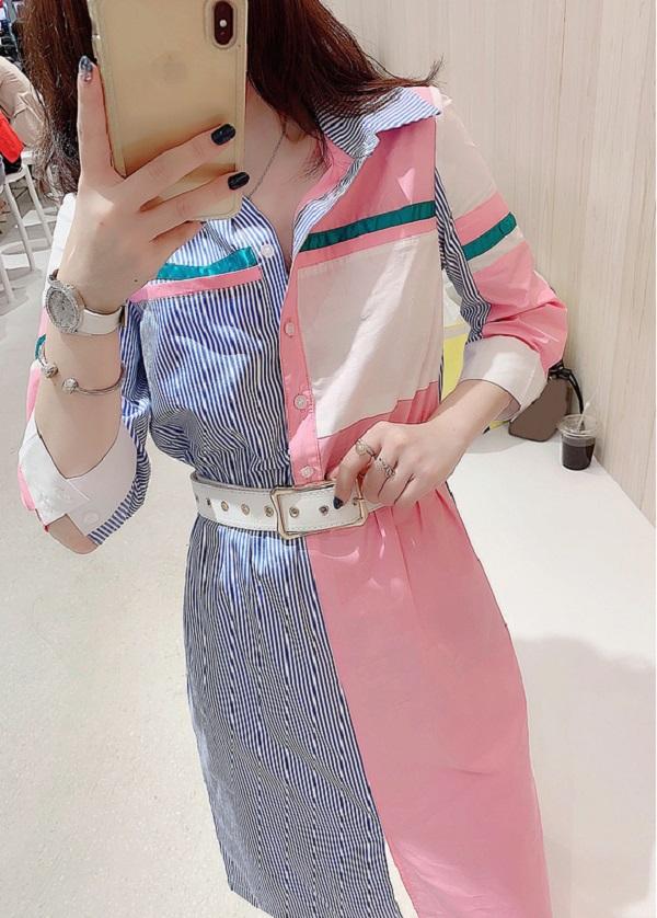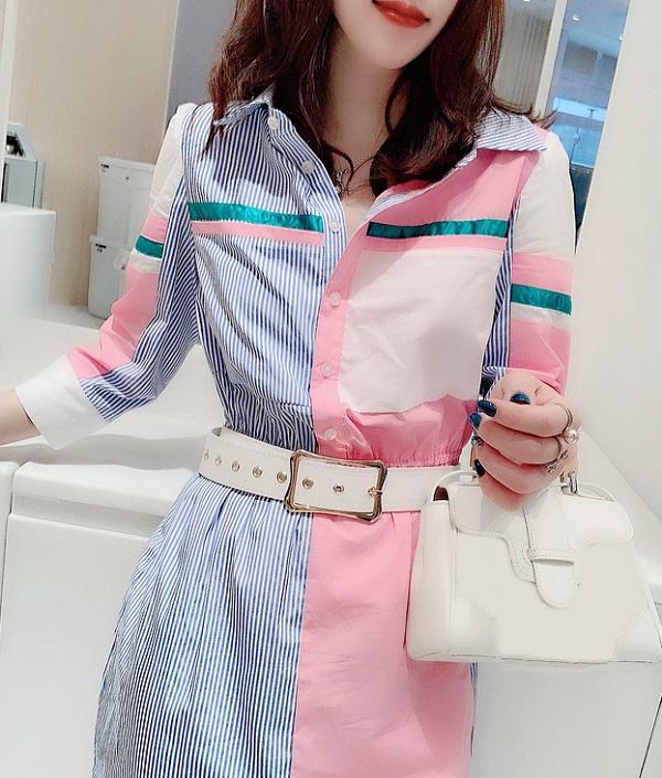 This dress incorporates the intellectual elegance of a shirt. The vertical stripe element makes the body slimmer and lifts the overall figure. The pink decoration adds a girlish touch. This AB-side design is very The fashion is eye-catching, and a belt around the waist is exquisite and fashionable.