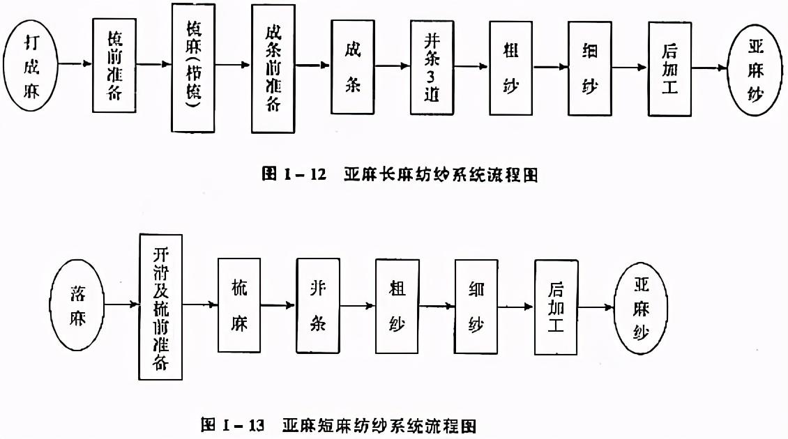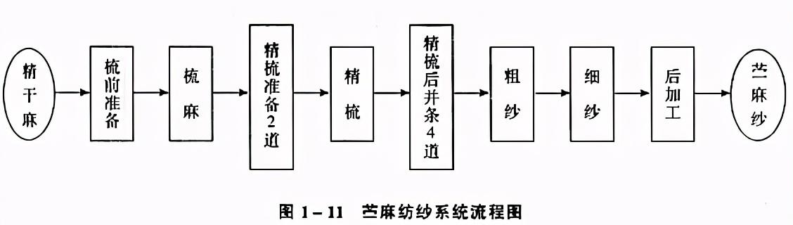 “>Generally, the worsted wool spinning or silk spinning system is borrowed, and only partial improvements are made on the equipment. The raw linen must first be pre-processed into fine linen, and the spinning process is shown in Figure 1-11; while short ramie, falling ramie Linen can generally be processed using a cotton spinning system.
