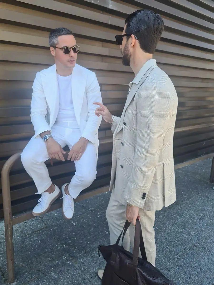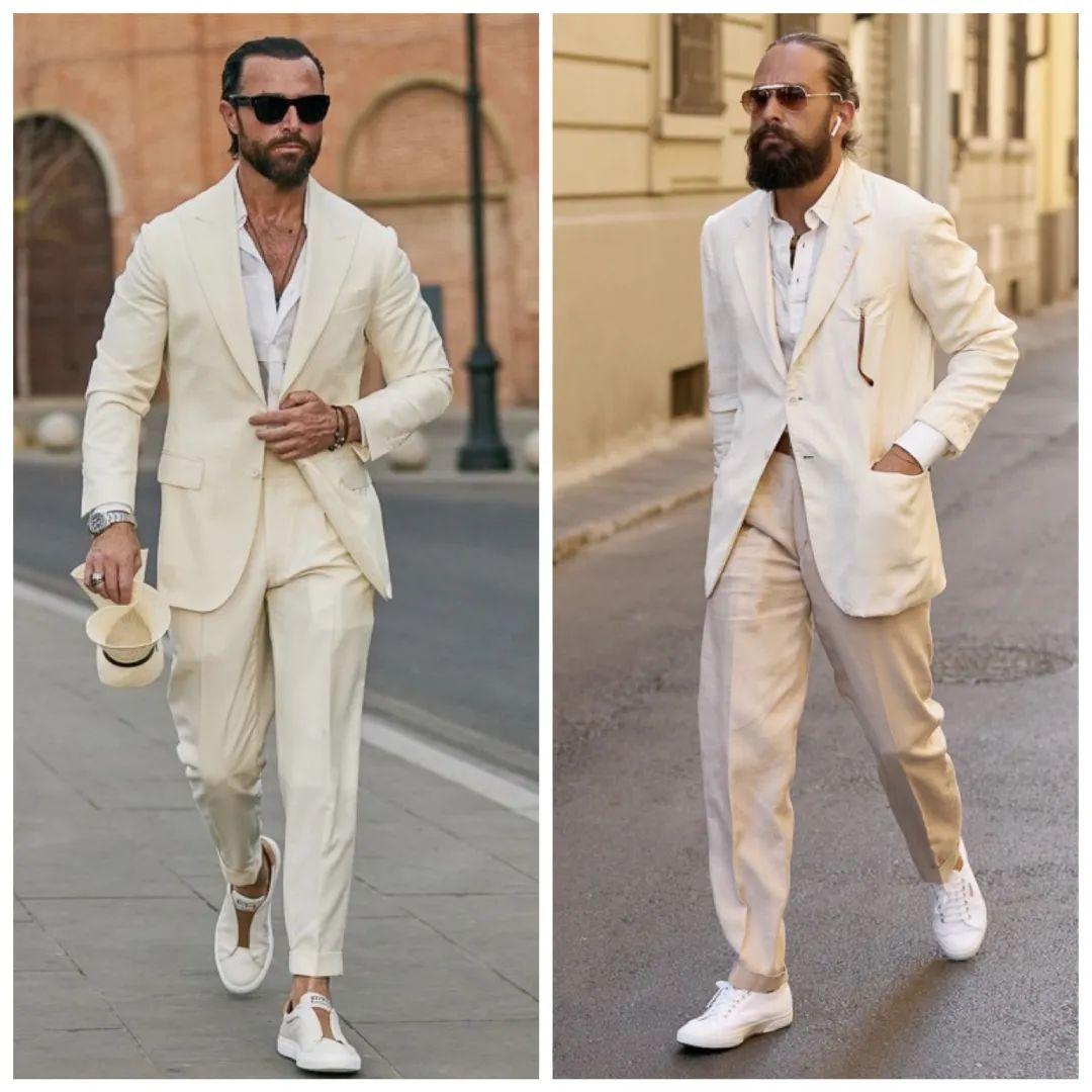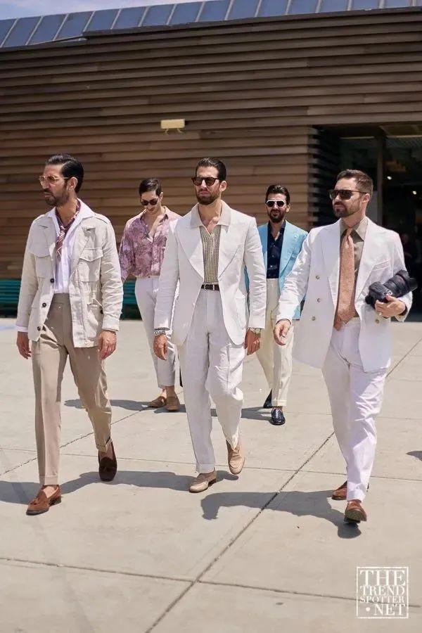 Many people are wearing this at Pitti Uomo this year. Off-white linen suit shirts paired with light-colored casual pants, in summer It looks particularly refreshing and clean, and with a pair of white shoes, it is effortlessly fashionable.