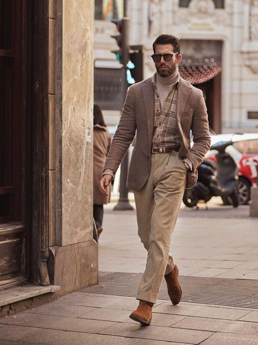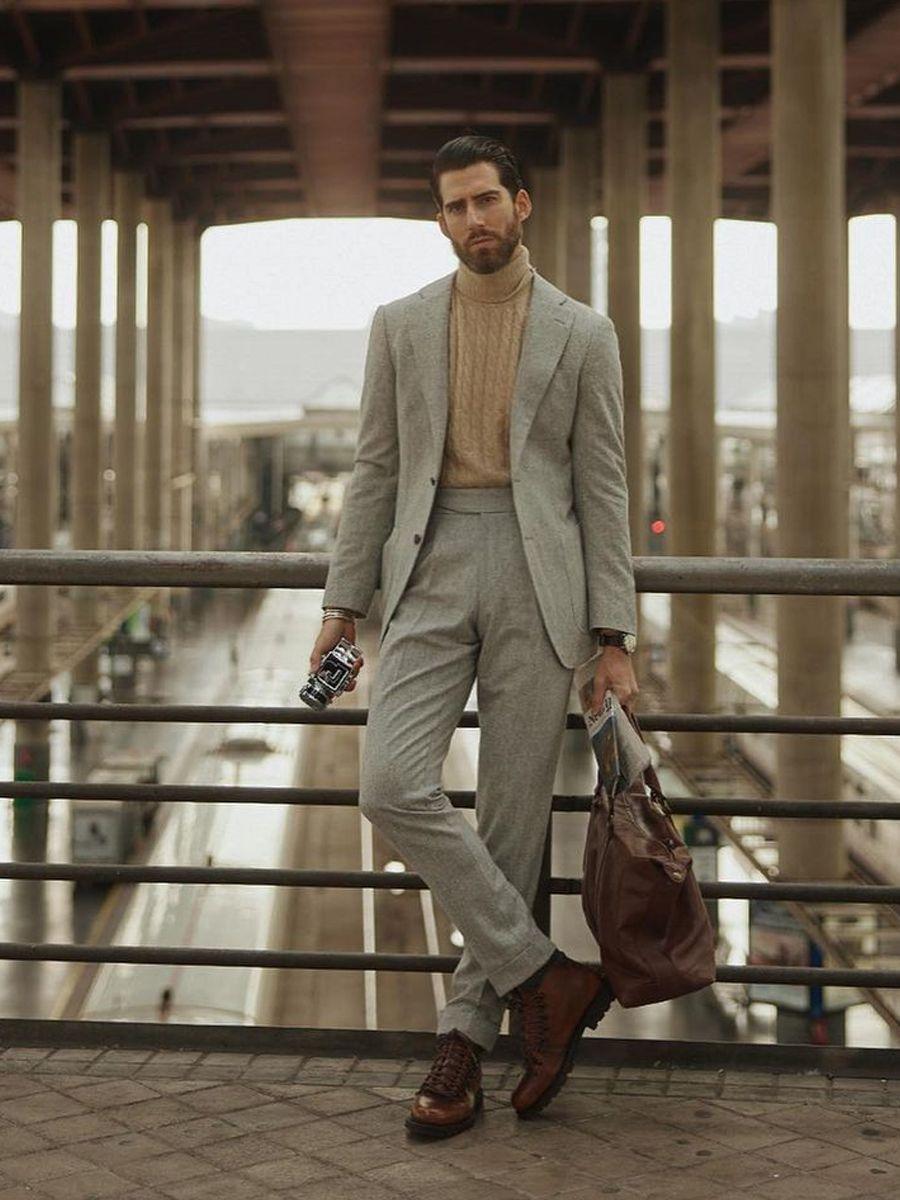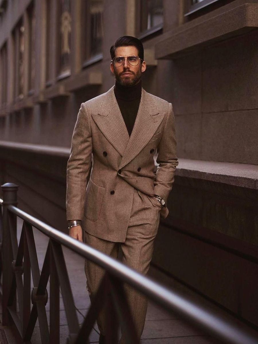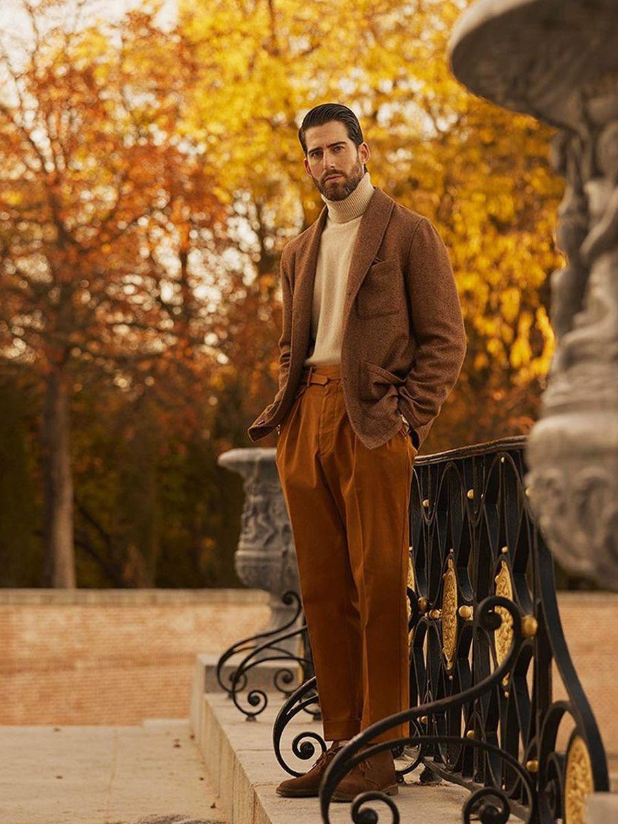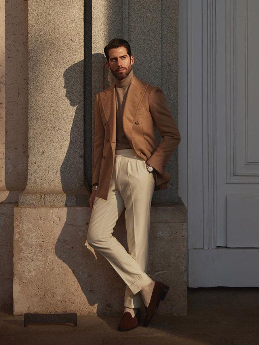 If you feel that the same color matching method above is monotonous, It doesn’t matter, you can try contrasting color matching methods, such as “brown suit jacket + white turtleneck sweater”, “light cardigan suit jacket + black turtleneck sweater”, strong color contrast not only creates a great visual impact on people , also adds layering to the overall look.