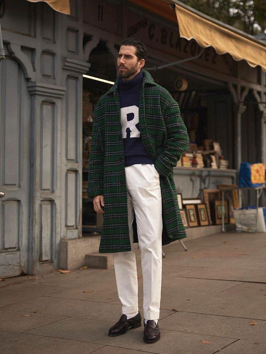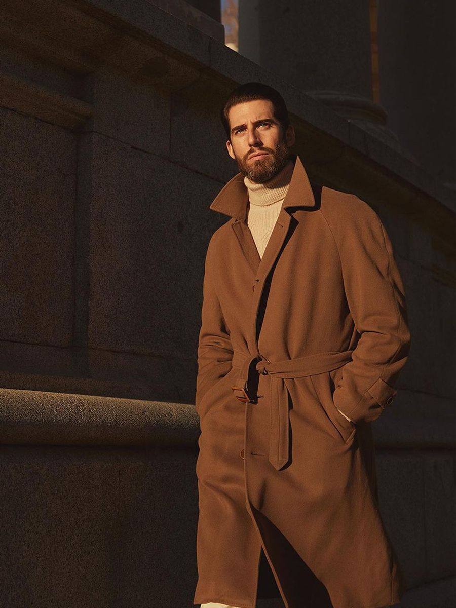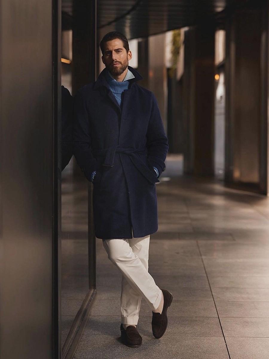 Brings a sense of luxury The woolen coat is most suitable to be paired with a turtleneck sweater. With its high-end charm, it not only improves the grade of the turtleneck sweater, but also demonstrates the extraordinary taste of men. In addition, the lapel design of the woolen coat perfectly matches the high collar design of the turtleneck sweater, keeping out the cold without looking bulky.