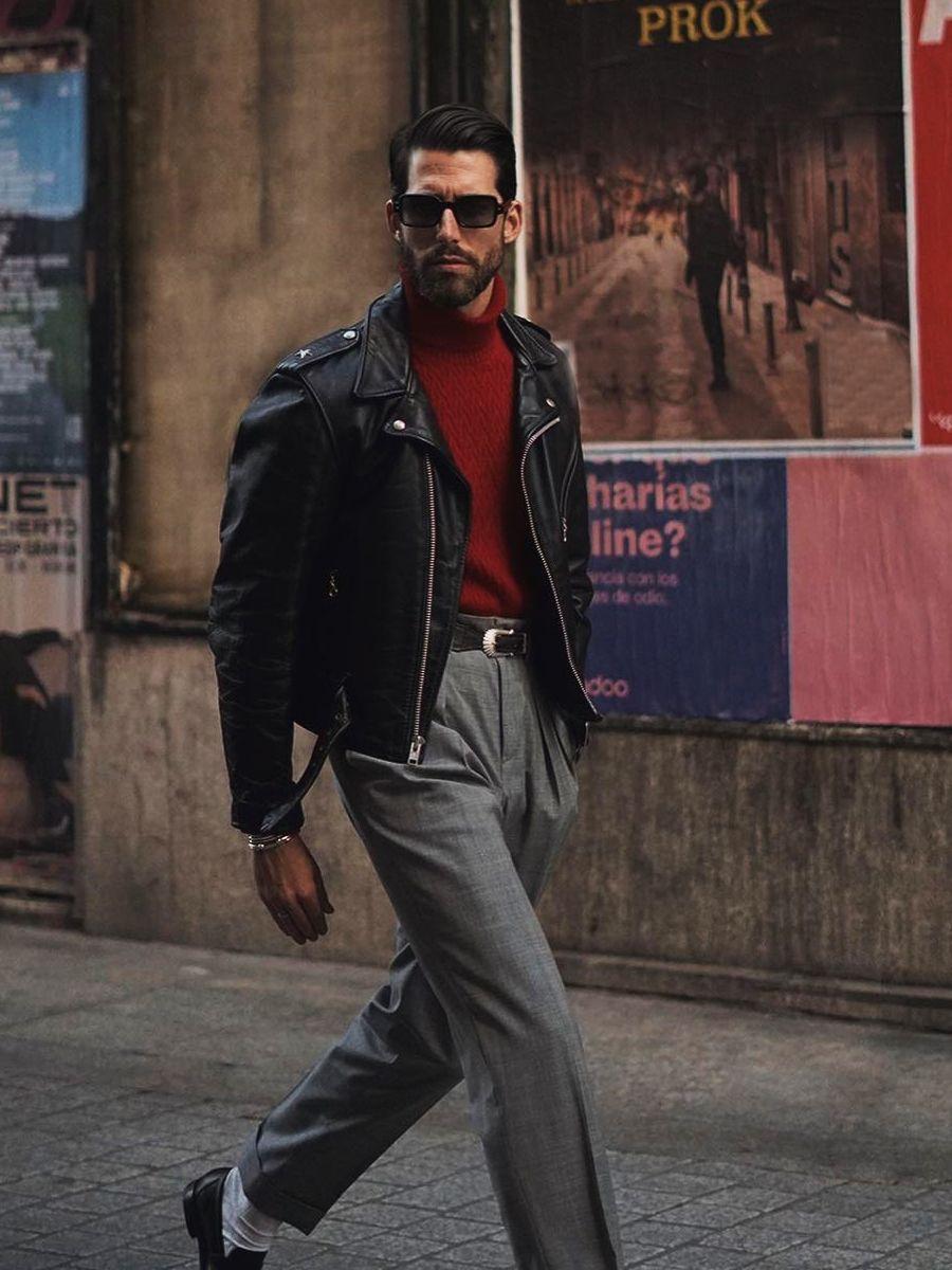 However, it should be noted that because the leather jacket and turtleneck The style charm of collared sweaters is very different. When we match “leather jacket + turtleneck sweater”, we must use classic color schemes, such as red + black, black + white, blue + white, etc. Only with the help of classic color matching can we Avoid the overall shape being abrupt.
