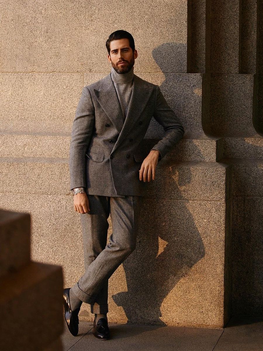 In addition, in the process of matching a suit jacket with a turtleneck sweater, the following The choice of clothing cannot be ignored, because bottoms are related to the overall effect of the outfit. In this regard, my suggestion is to choose suit trousers, and match the color of the suit trousers with the color of the suit jacket. This kind of matching method is easy to use and requires no skills.