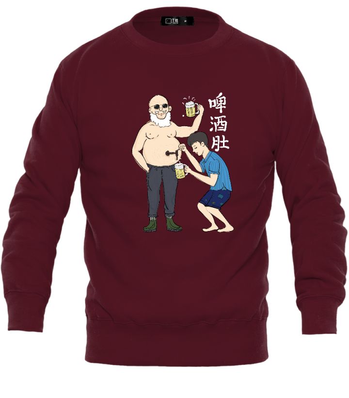 This This model is a custom-made sweatshirt – beer belly. In the pattern of this creative cultural shirt, a man with a gray beard is holding a glass of beer with his belly open. There is a tap on the round beer belly, and the young man is using the tap to receive the beer. Copywriting It is a very straightforward “beer belly”. The painting style is simple, the patterns are interesting and ironic, in order to persuade young people to drink less, love life and care for their health.
