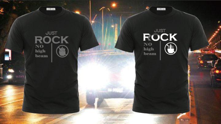 A customer-initiated pre-sale of a T-shirt – Reject high beams. Under normal light, the text displayed on the clothes is “JUST”