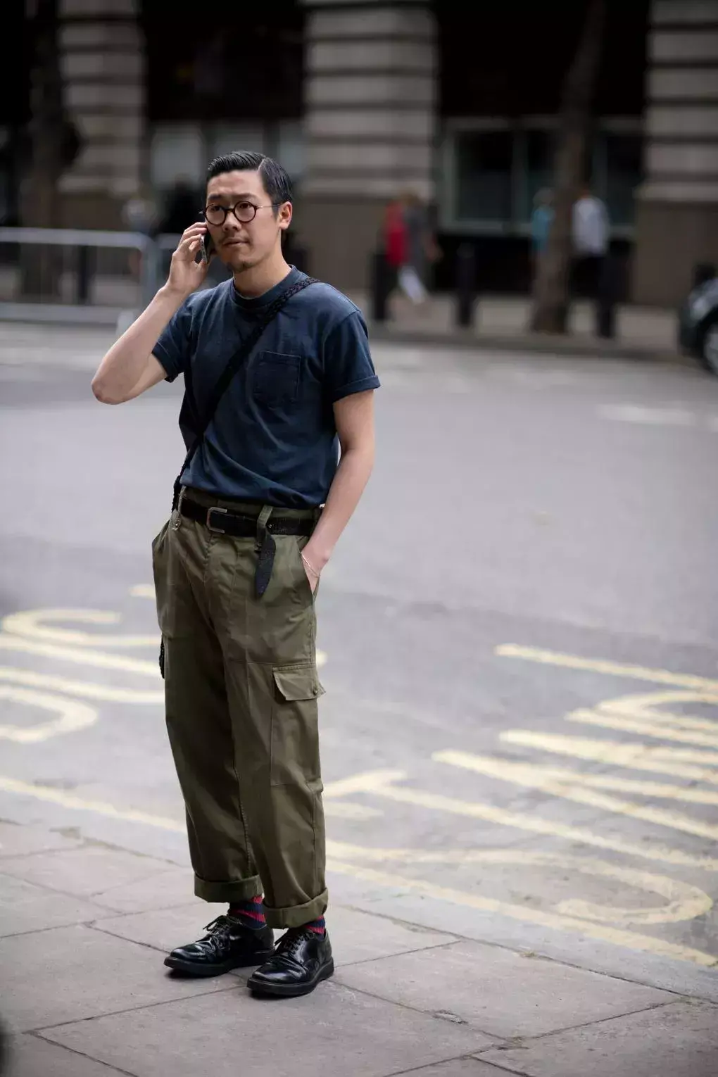 所以在这里,向你推荐一些 阔腿的工装裤款。它能够为简单普通的T恤Look带来少有的型格。虽然没有了优雅感,但却够Man,够“ 粗犷 ”。加双油感皮鞋,和露出做旧的皮带,质感提升也明显,少见的搭配方式,为你赚够旁人的目光。