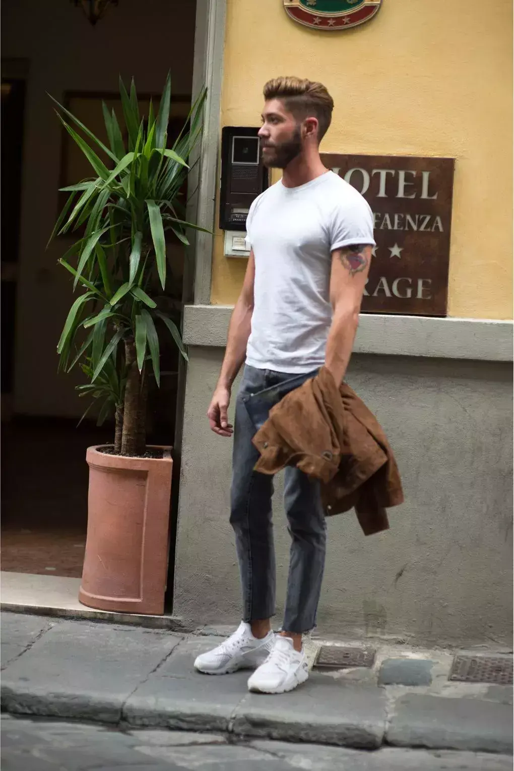 其实久了你也可以换一下,反其道而行之,黑色T恤加上白裤子。黑色上衣显瘦,而白色裤款雅致之余,也能够让你的下身“ 膨胀 ”(变长)起来。当然,这并不适合腿粗下身壮的男士选择。