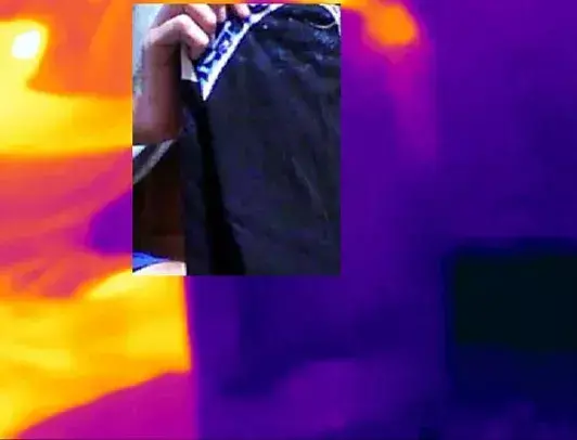 Those dark things on the shirt are just a little bit of water. When water changes from a liquid to a gas, it removes heat, causing the temperature to drop, which is why humans sweat – we cool down by evaporating heat from the surface of the body as sweat evaporates. Also, check out the mylar on the right. It looks different because it reflects both visible and infrared light. This makes measuring temperature with an infrared camera quite difficult because you see reflected light rather than emitted light.