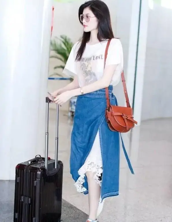 He Sui appeared at the Beijing Airport, wearing a mesh T-shirt and a denim spliced ​​slit skirt for the bottom, which was casual yet elegant. The slit skirt with denim and lace looks very unique. In addition, the skirt is designed with a high waist and is decorated with laces. When short people wear it, remember to tuck the T-shirt into the skirt. , it looks tall and trendy when worn like this!