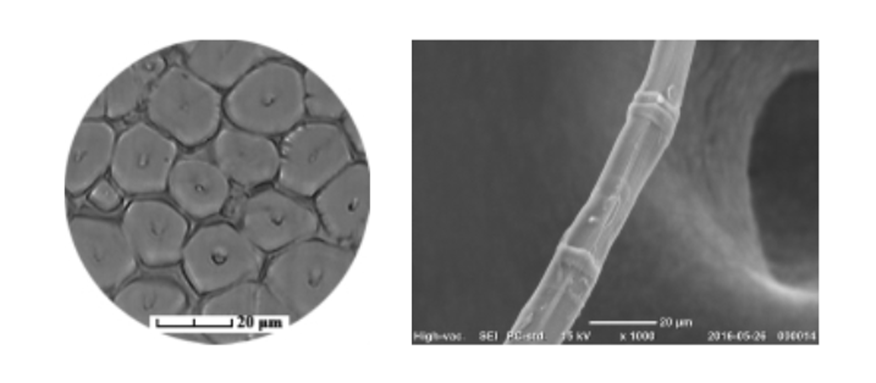 The cross-section and longitudinal morphology of flax fiber under the microscope. Picture source: Yan Huina, Zhao Feng, Xing Mengyang, Wu Ziying. Research on the identification of two cultural relics flax fibers [J]. Journal of Zhejiang Sci-Tech University (Nature Science Edition), 2017,37(02):185-189.