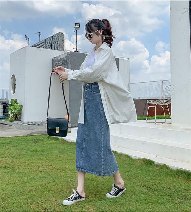 Wear a shirt as a jacket, match it with a T-shirt and a long denim skirt. It is fashionable and casual, less restrained and more playful.