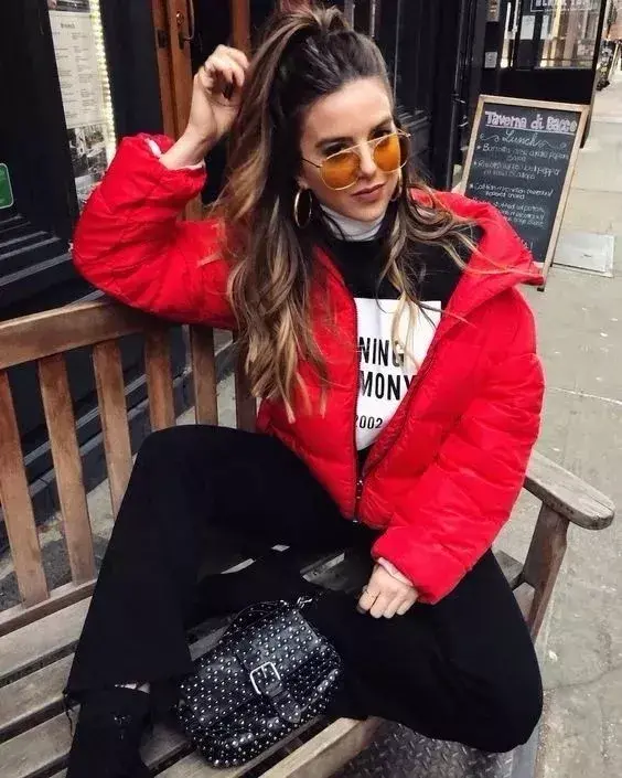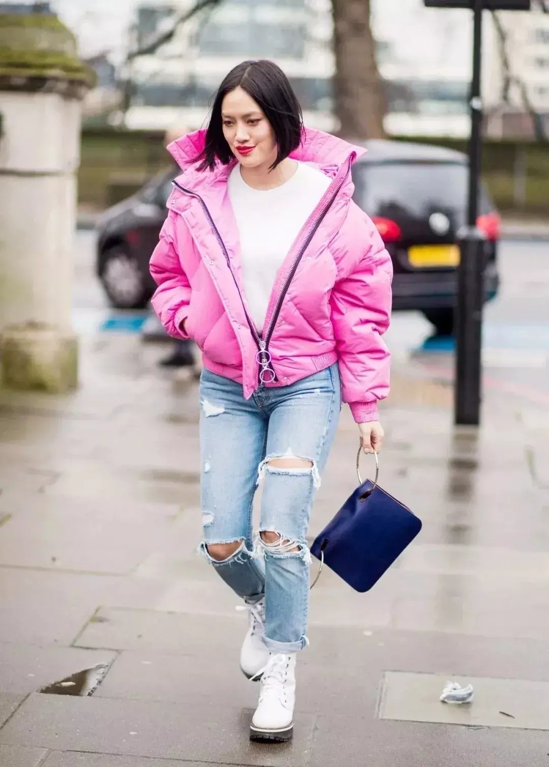 Colorful down jackets are inherently attractive, so wearing a simple sweatshirt underneath is enough to attract attention. People are paying attention.