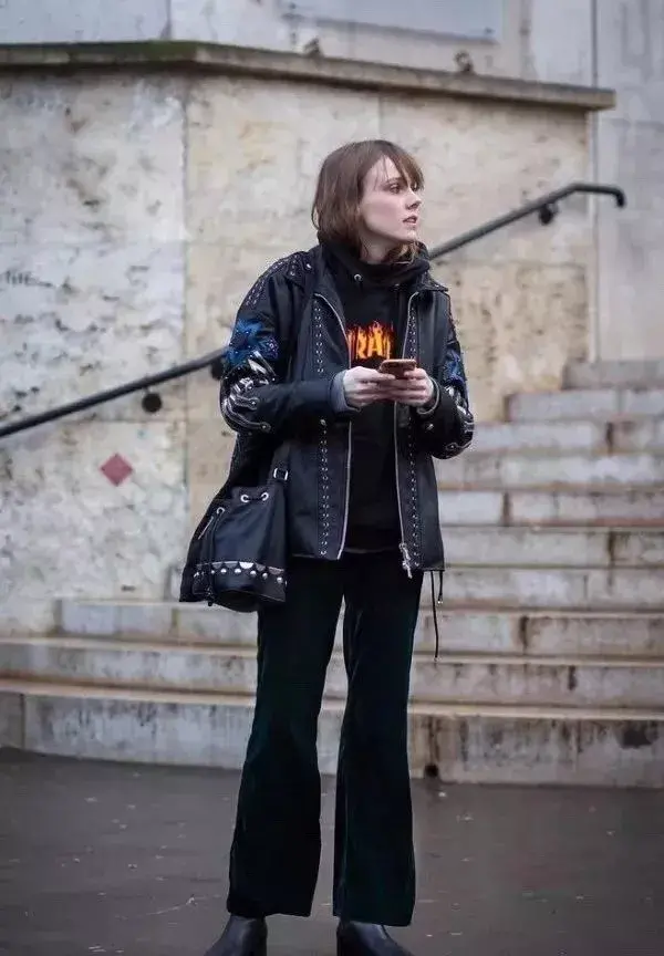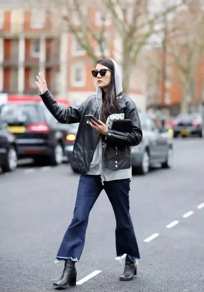 Especially for black leather clothes, Pair it with a sweatshirt and the impact of different fabrics to create a stronger fashion spark.