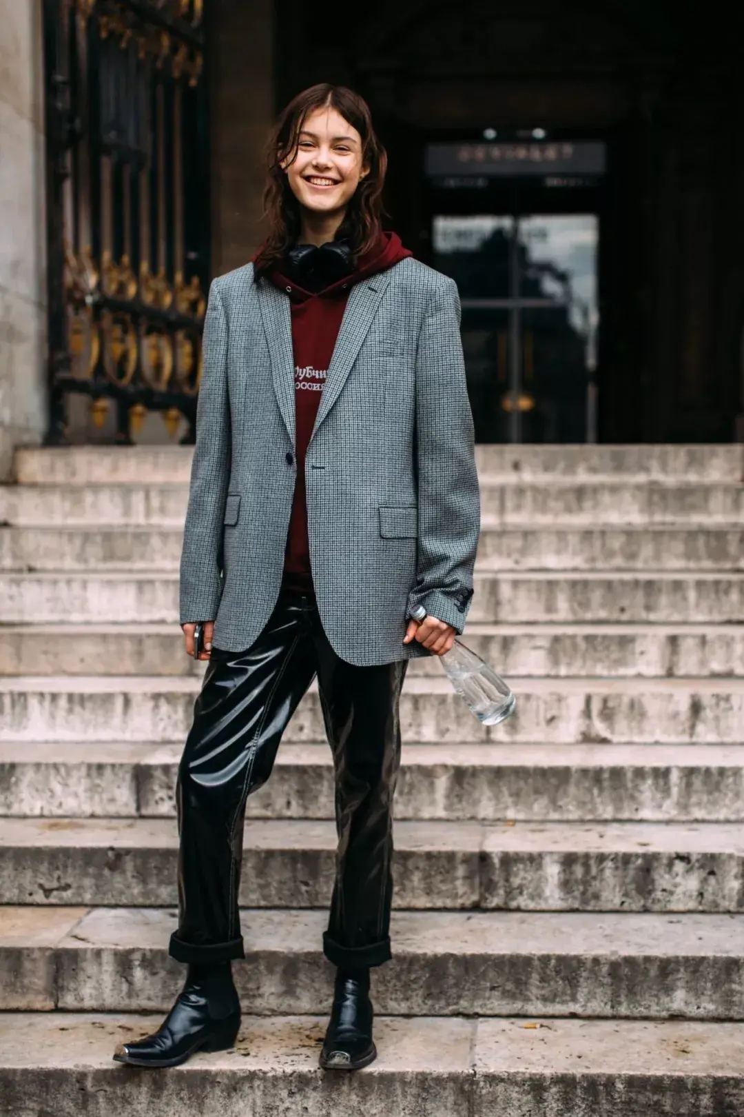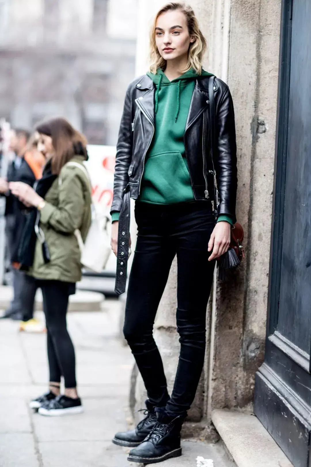 The softness of the sweatshirt can dissolve the stiffness of the leather. Therefore, such a simple combination is often more atmospheric and attractive.