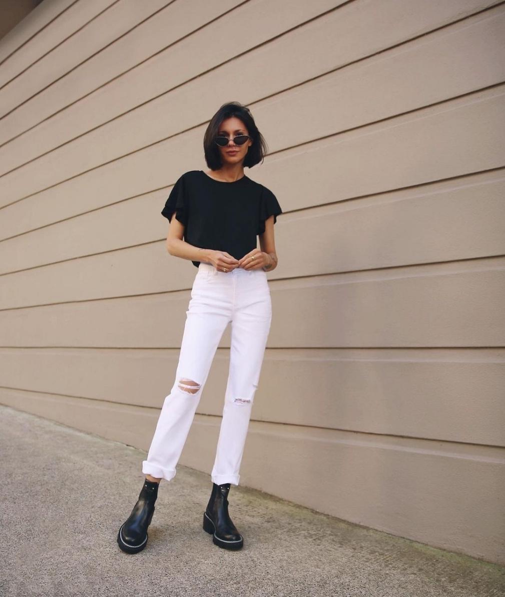 ⑩纯色T恤可以在衣服设计方面做一些奇思妙想,例如这件黑色圆领T恤,线条有力,穿上之后神采飞扬,袖子微微蓬起为利落线条增加流动性,又俏皮又休闲,下面配上高腰破洞白色直筒裤,好比例、大长腿、纤细蛮腰、潮酷风格,同时收入囊中。就这么一点细节设计,整套极简搭配的品质骤然提升。脚踩马丁靴帅气洒脱,换成是帆布鞋青春元气,随你所想,穿出适合的风格。