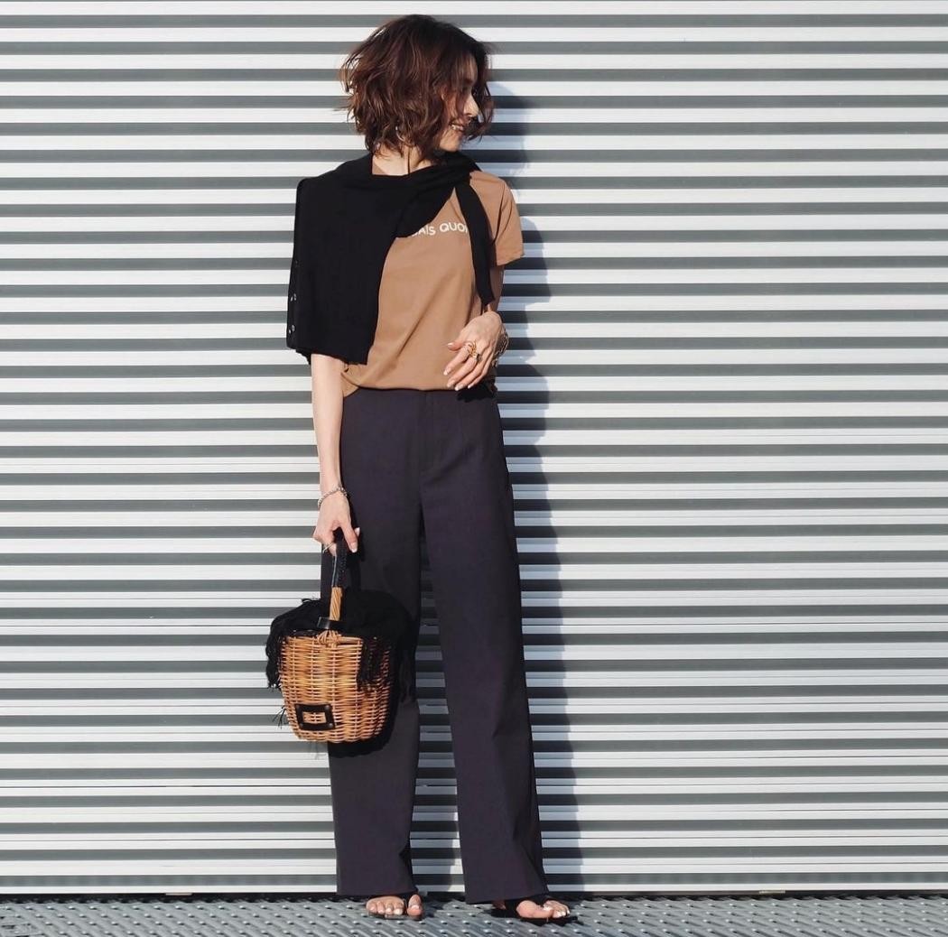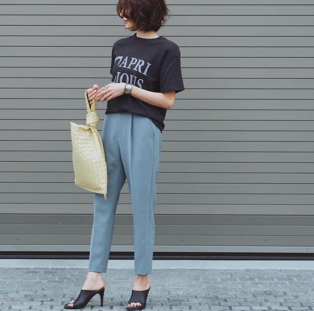 ⑮黑色字母T恤+蓝色锥形西装裤,知性女性休闲随性与干净利落通过服装融二为一,展现职业女性风采的同时、也利用收紧的裤脚将腿部线条拉伸。