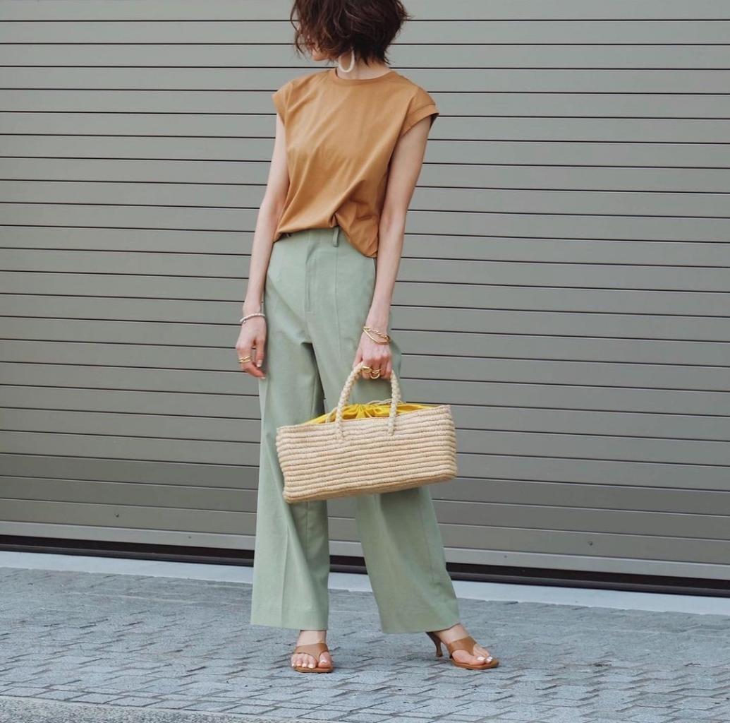 ⑦棕色圆领T恤,立体剪裁的廓形设计、配合落肩袖、将干练利落的都市之美刻画于无形。下面的这条薄荷绿色阔腿裤,遮肉显瘦的一把好手,让高挑的腿部变得更加纤长,高腰线修饰比例、配饰点缀增加亮点、鞋子和T恤交相辉映、让色彩趋于和谐。这些不为人知的小技巧,才能让基础款美得毫不逊色。